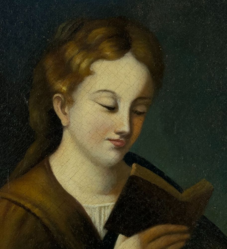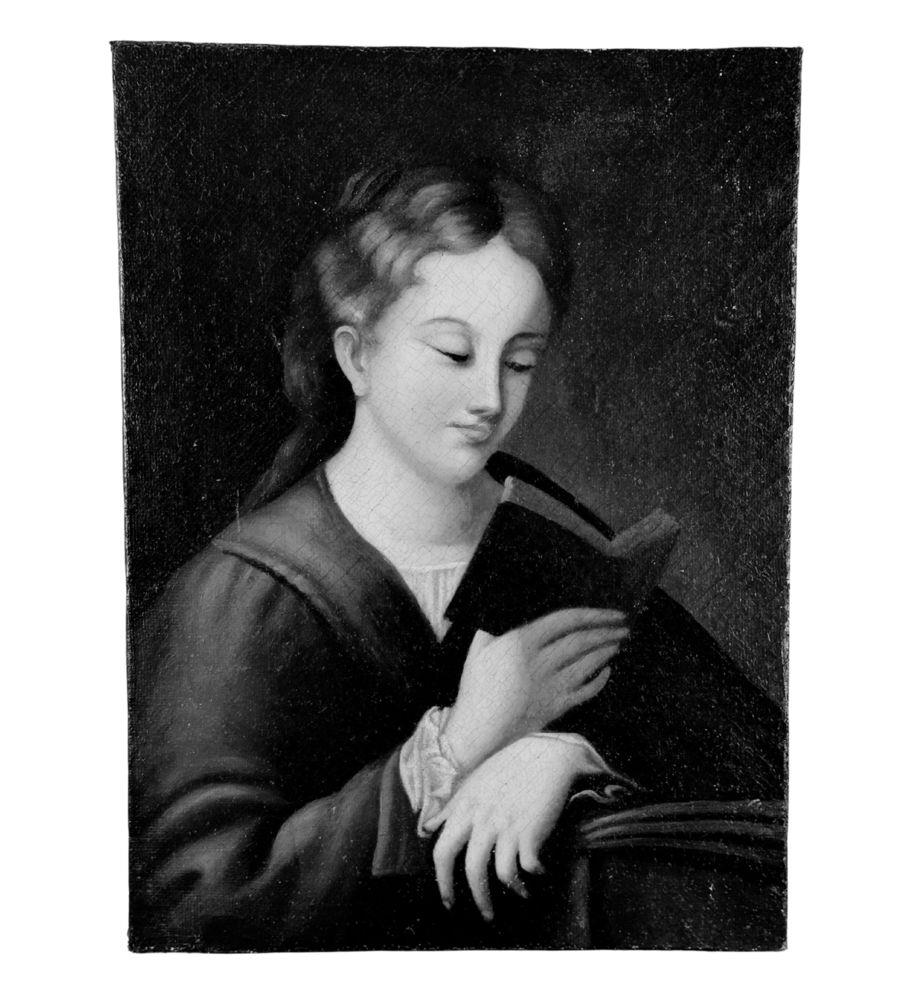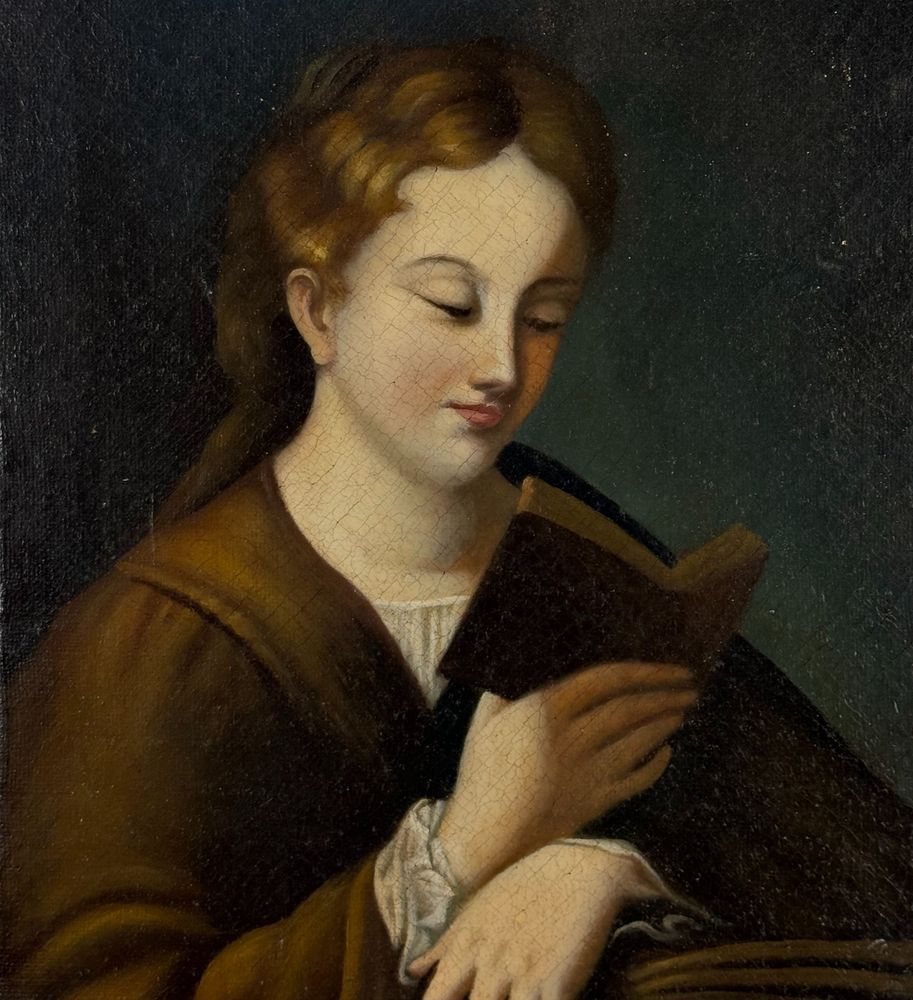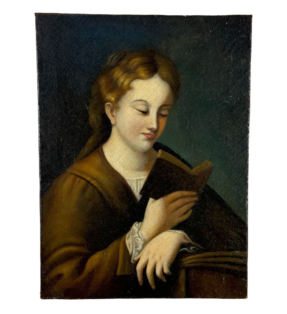 Dipinto olio su tela, periodo XIX/XX secolo scuola Italiana accademico, raffigurante Ritratto di donna mentre legge. Probabile copia d'autore. Dimensioni: 40x54 cm. Da artista anonimo. Opera in buone condizioni.