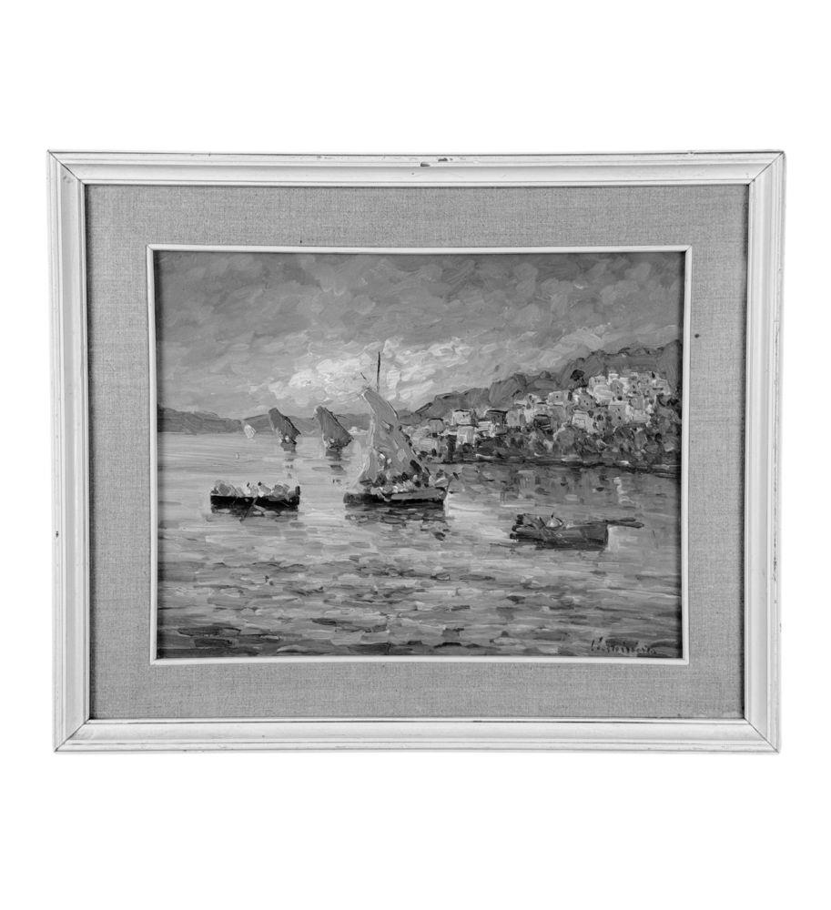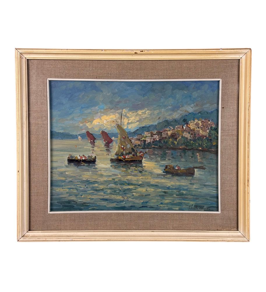 Dipinto olio su pannello, periodo XX secolo scuola Italiana, raffigurante Scorcio di marina con barche. Dimensioni compreso cornice: 48x40 cm. Dimensioni interno cornice: 30x39 cm. Reca firma in basso a destra da artista non identificato. Opera in buone condizioni.
