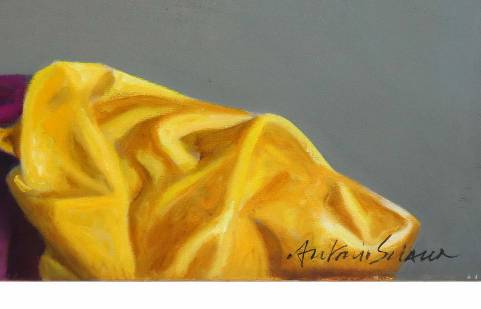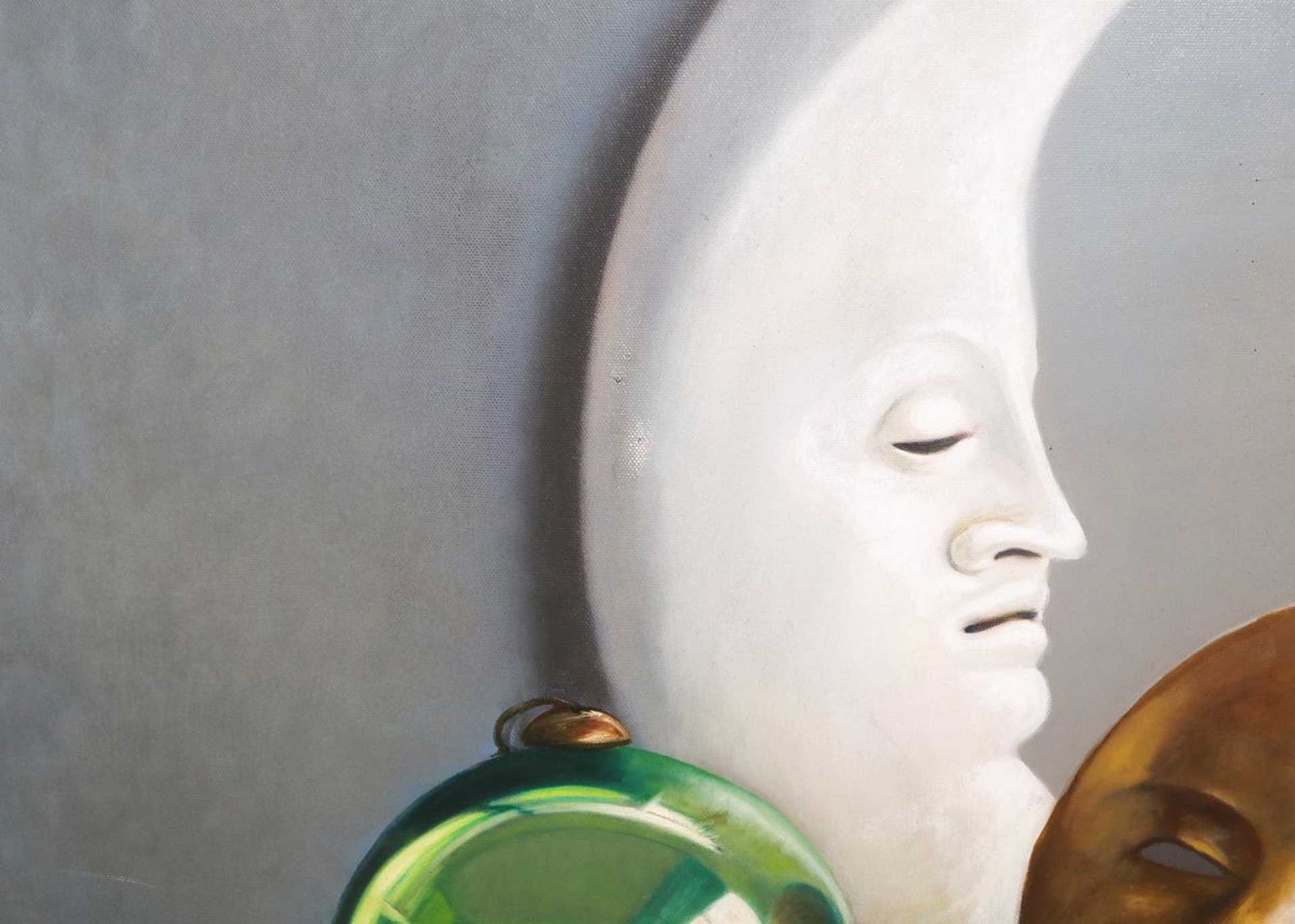 Antonio Sciacca (Catania 1957) - Luna bianca con sfere cm 60x80 Olio su tela Firmato in basso a destra e sul retro. Sul retro scritta ''appartenente alla corrente del Metropolismo''