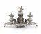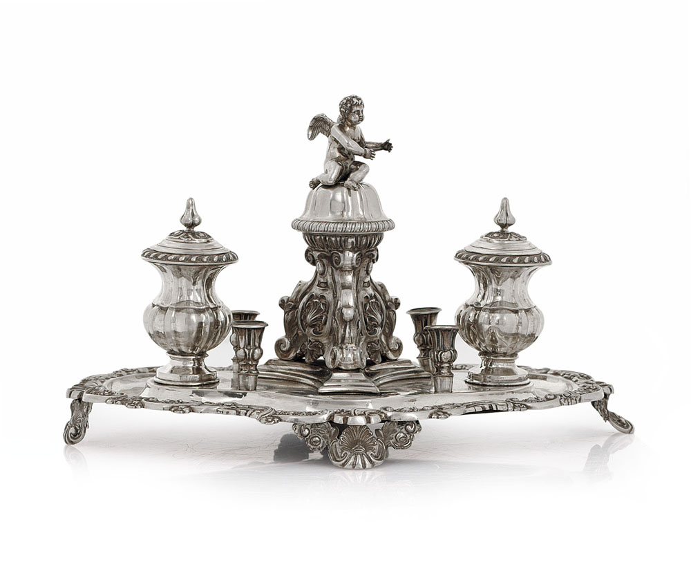 CALAMAIO IN ARGENTO, REGNO LOMBARDO VENETO, 1850 CA., base quadrilobata e sbalzata a volute centrata da sostegno tripode con campanello cimato da putto, doppio vaso con coperchio e quattro porta penna.