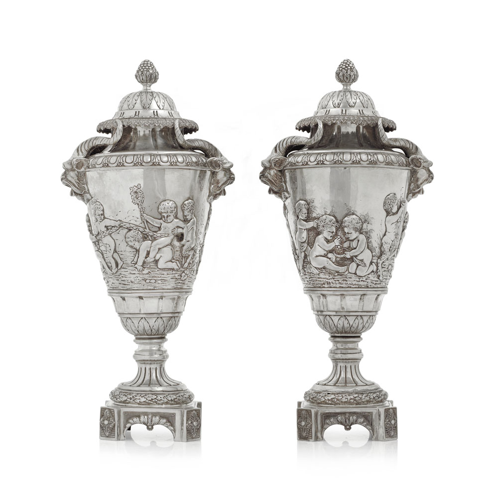 COPPIA DI VASI CON COPERCHIO IN ARGENTO, XIX SECOLO, a balaustro con anse a teste di fauno e cimati da pigna, sbalzi a fascia continua con giochi di putti e piccoli fauni.