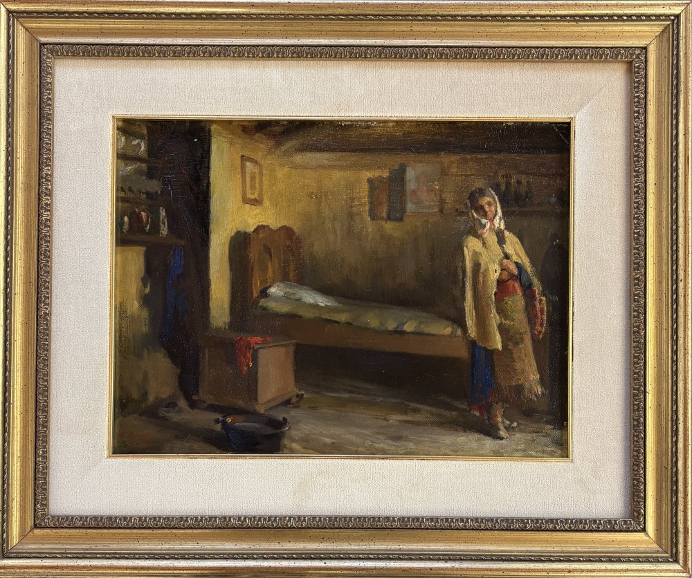 Oreste Pizio Torino 1879 - 1938 Nole (TO) Interno con figura Olio su cartone cm 28x38 firmato in basso a sx datato 1919