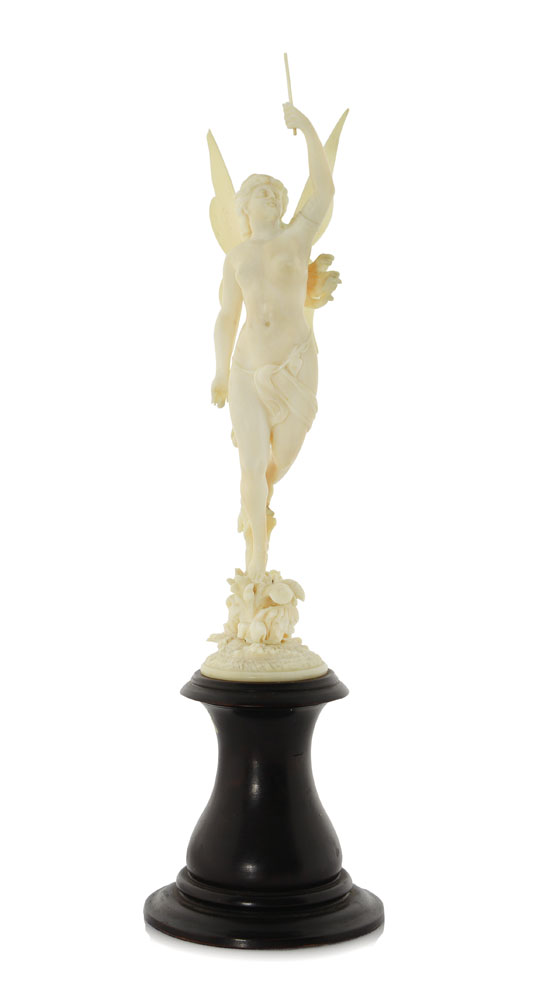 SCULTURA IN AVORIO, DIEPPE, XIX SECOLO, raffigurante allegoria con giovane fanciulla alata su base in legno ebanizzato; lievi sbeccature.