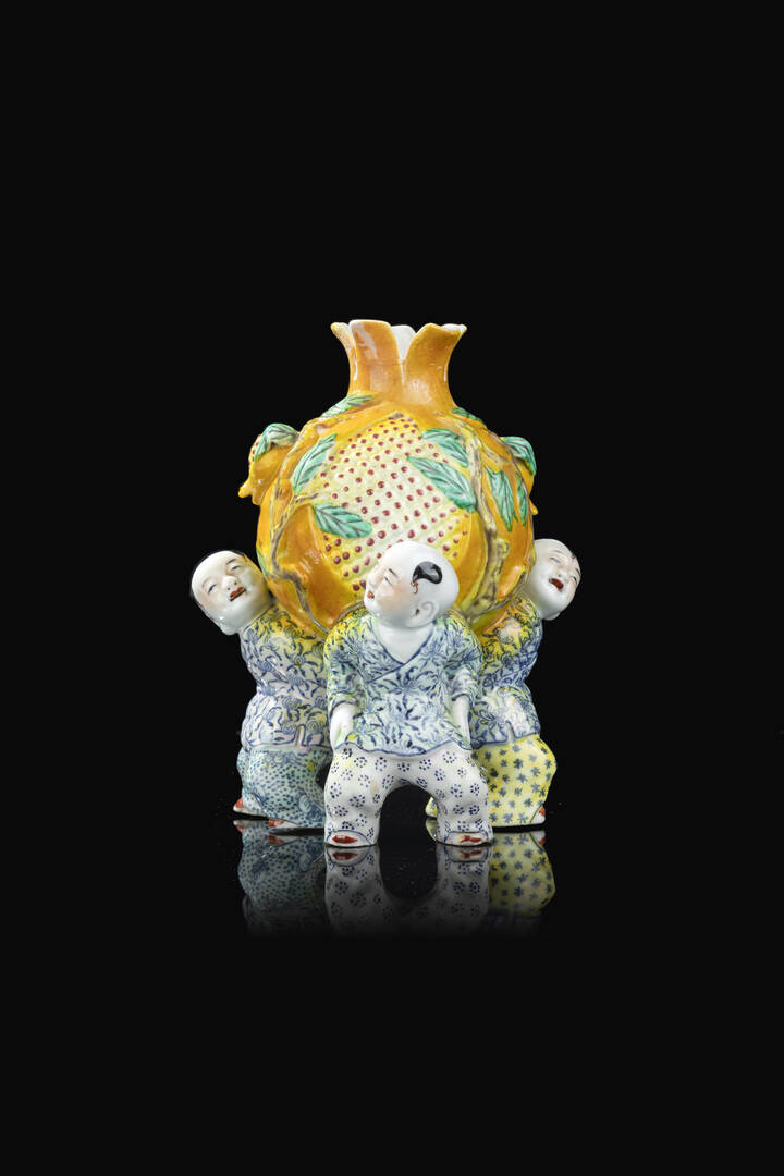 Vaso a forma di melograno sorretto da tre fanciulli in porcellana Famiglia Rosa, Cina, Repubblica, XX Sec.