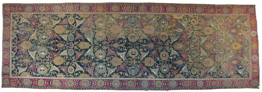 Tappeto di antica manifattura, fine XVI- inizio XVII secolo, cm. 614x217, mq.13,32; usure, restauri e alcune mancanze.