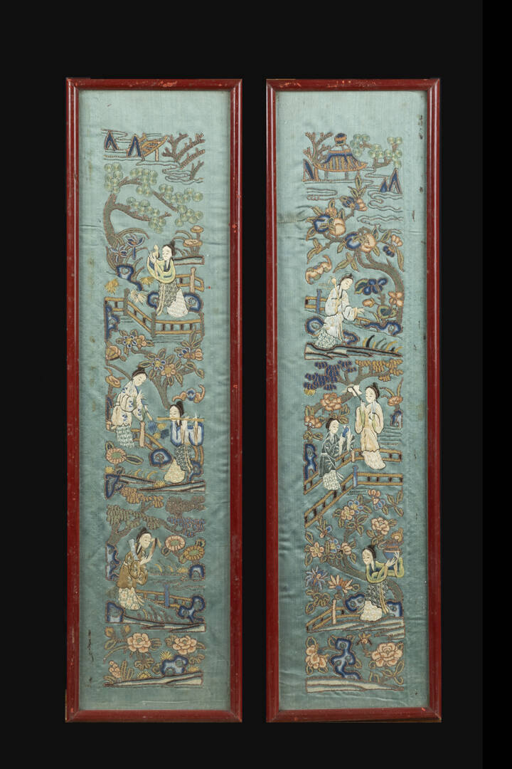 Coppia di ricami rappresentanti figure in giardino, Cina, Repubblica, XX Sec.