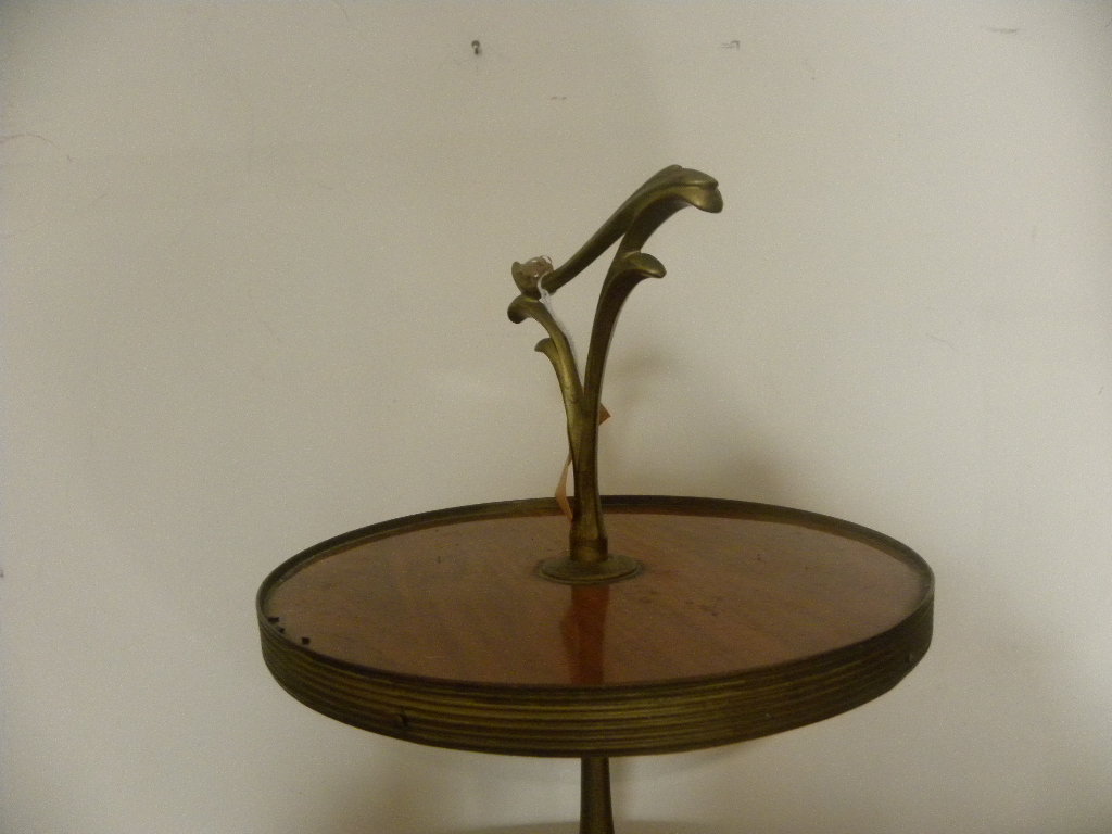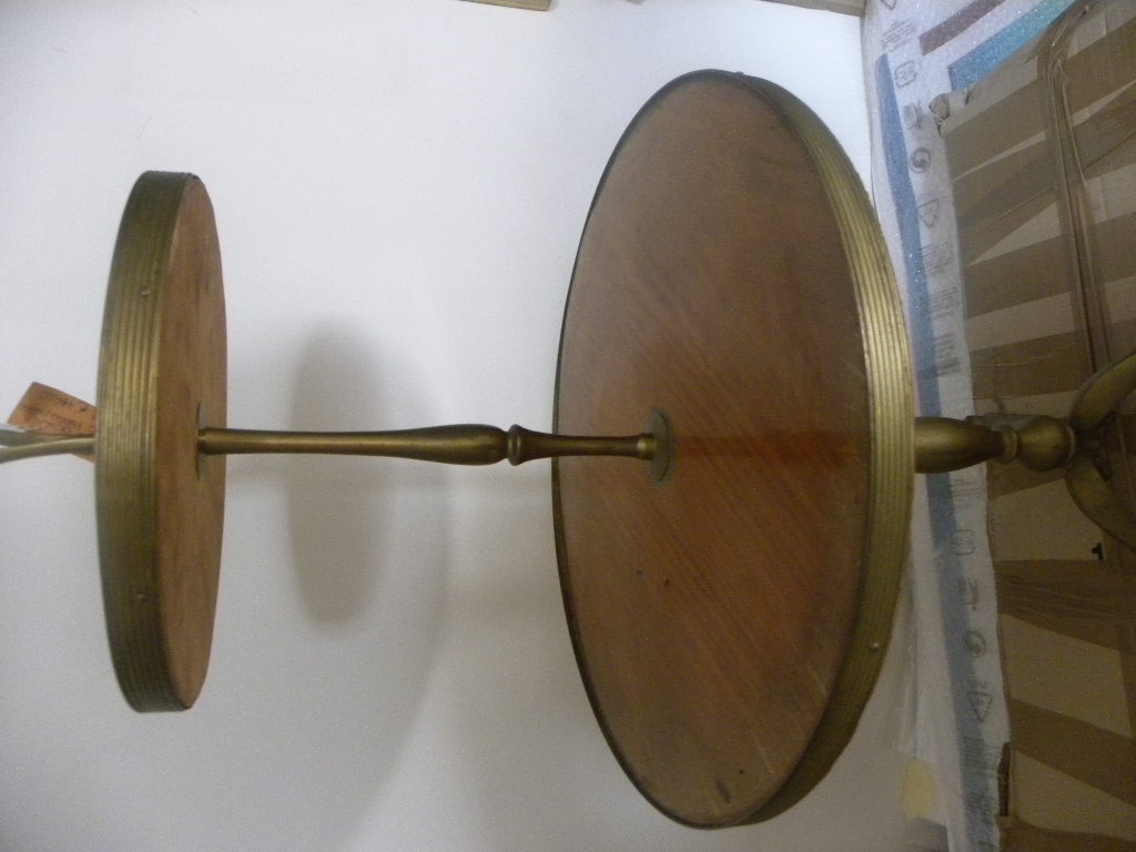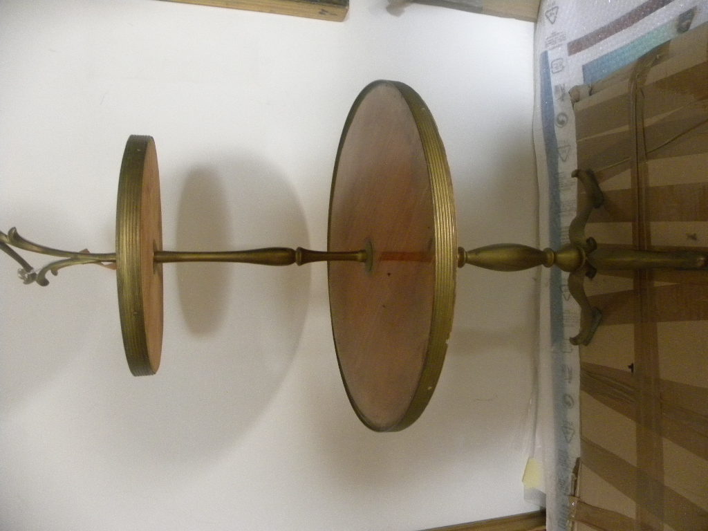VINTAGE – Anni 70, Tavolino a due Piani Rotondi in Legno ed Ottone a Tre Piedi H CM 80 Circonferenza Piano Alto CM 40, Circonferenza Piano Basso CM 25, Ottime Condizioni