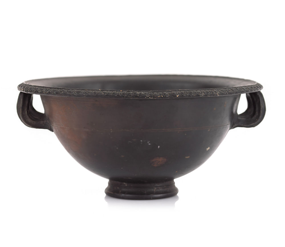 GRANDE COPPA IN TERRACOTTA VERNICIATA, MAGNA GRECIA, IV SECOLO A.C., ovoidale a due anse con orlo ornato da ovoli in rilievo; restauri.