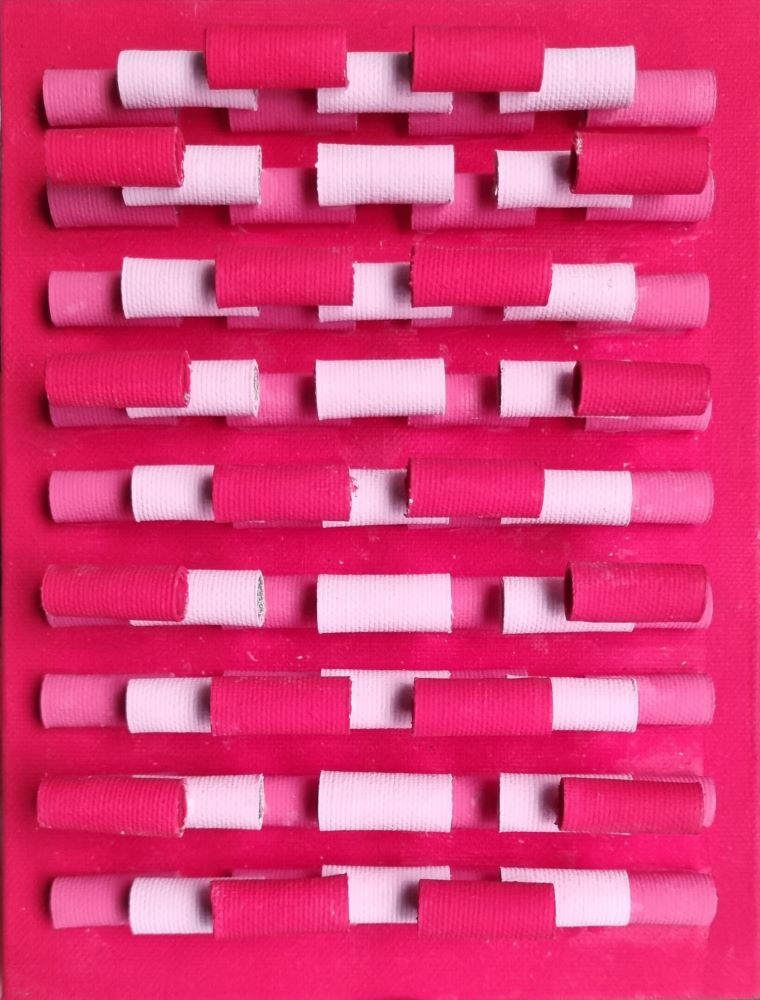 FASANO FRANCESCO Fasano 1966 "Risvolti" Tele arrotolate sovrapposte su pannello cm 15x20, del 2018. Al verso firma, titolo, data, tecnica e misure.