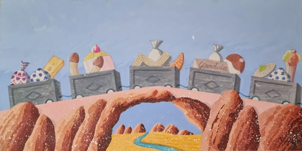 APHEL FABIO Cavalese (TN) 1957 "Il trenino" Olio su tavola cm 40x20. Firmato sul fronte in basso a destra. Al verso firma, titolo e numero d'archivio.