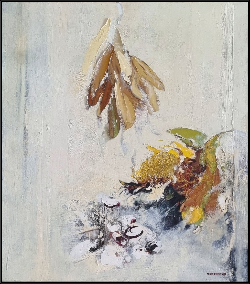 CAZZANIGA GIANCARLO Monza 1930 - 2013 "Interno" Olio su tela cm 80x90 del 1976-1985. Firmato sul fronte in basso a destra. Sul retro intitolato e datato.