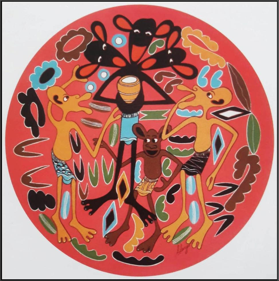 LILANGA GEORGE Tanzania 1934 - 2005 "Mapacha wenye vivywa" Acrilico su tavola cm 100 di diametro del 1999. Provenienza "Sarenco Collection". Opera pubblicata a pag. 166 del catalogo ragionato "George Lilanga" Volume II.