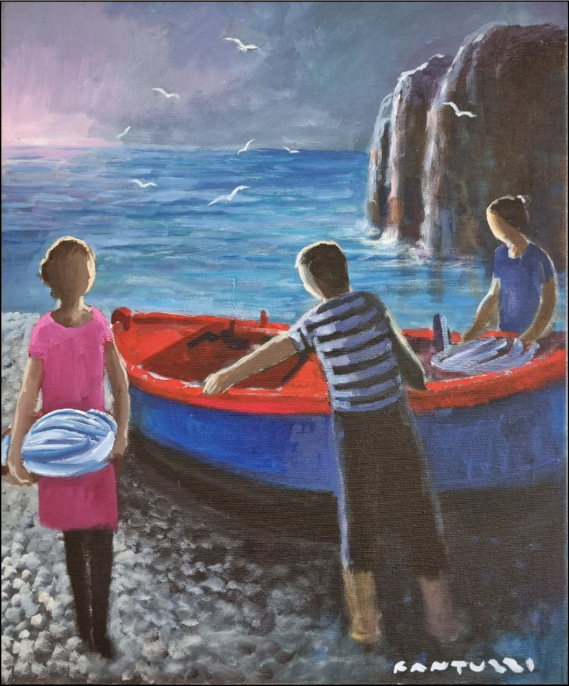 FANTUZZI ELIANO Modena 1909 - Verona 1987 "Pescatori" Olio su tela cm 50x60 del 1984. Firmato sul fronte in basso a destra. Al verso firma e timbro dello studio dell'Artista, con numero di catalogazione. Archivio su foto a cura dell'Artista, autentica su foto a cura di altra casa d'aste.