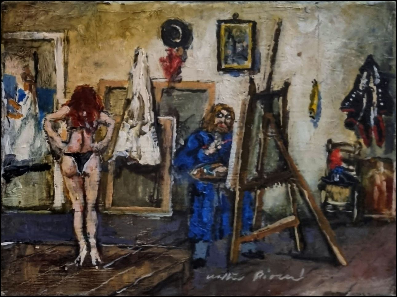 PIACESI WALTER Ascoli Piceno 1929 - Fermignano 2022 "Pittore e modella" Olio su tavola cm 24x18. Firmato sul fronte in basso a destra. Sul retro firma, titolo, tecnica e misure. Autentica su foto a cura del Maestro.