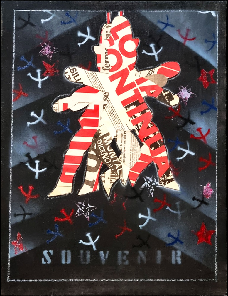 ANGELI FRANCO Roma 1935 - 1988 "Souvenir" Tecnica mista su tela con collage di fogli di giornali de "L'Unità" e "Lotta Continua", cm 45,5x35, di inizio anni '80. Firmata "Angeli" sul retro in alto. Archivio Franco Angeli - Roma, su foto.