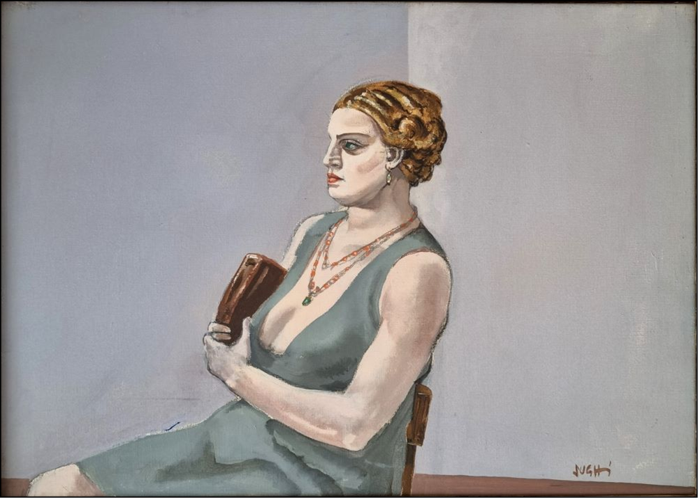 SUGHI ALBERTO Cesena 1928 - Bologna 2012 "L'attesa" Olio e tecnica mista su tela cm 70x50 del 1976/77. Firmato sul fronte in basso a destra, intitolato al verso. Autentica su foto a cura della Galleria L'Immagine (Arezzo).