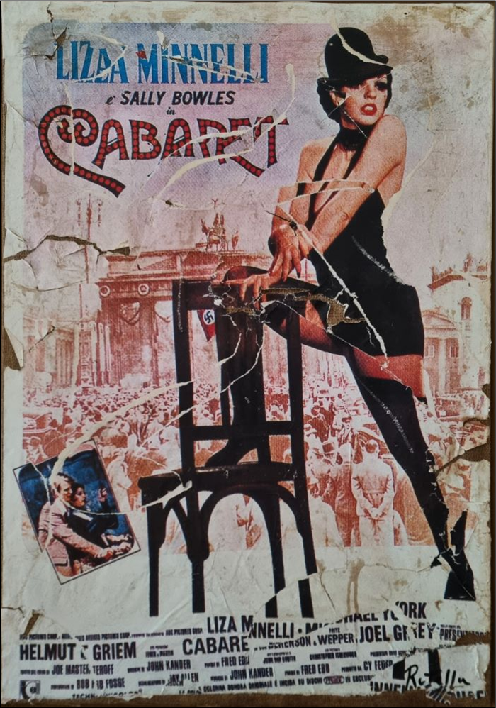 ROTELLA MIMMO Catanzaro 1918 - Milano 2006 "Cabaret" Decollage su tela cm 70x100 del 2001. Firmato sul fronte in basso a destra. Sul retro titolo, anno, firma e misure. Archivio su foto fronte/retro a cura del Nuovo Archivio Mascitti.
