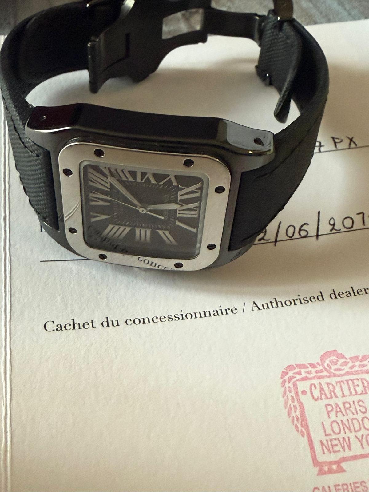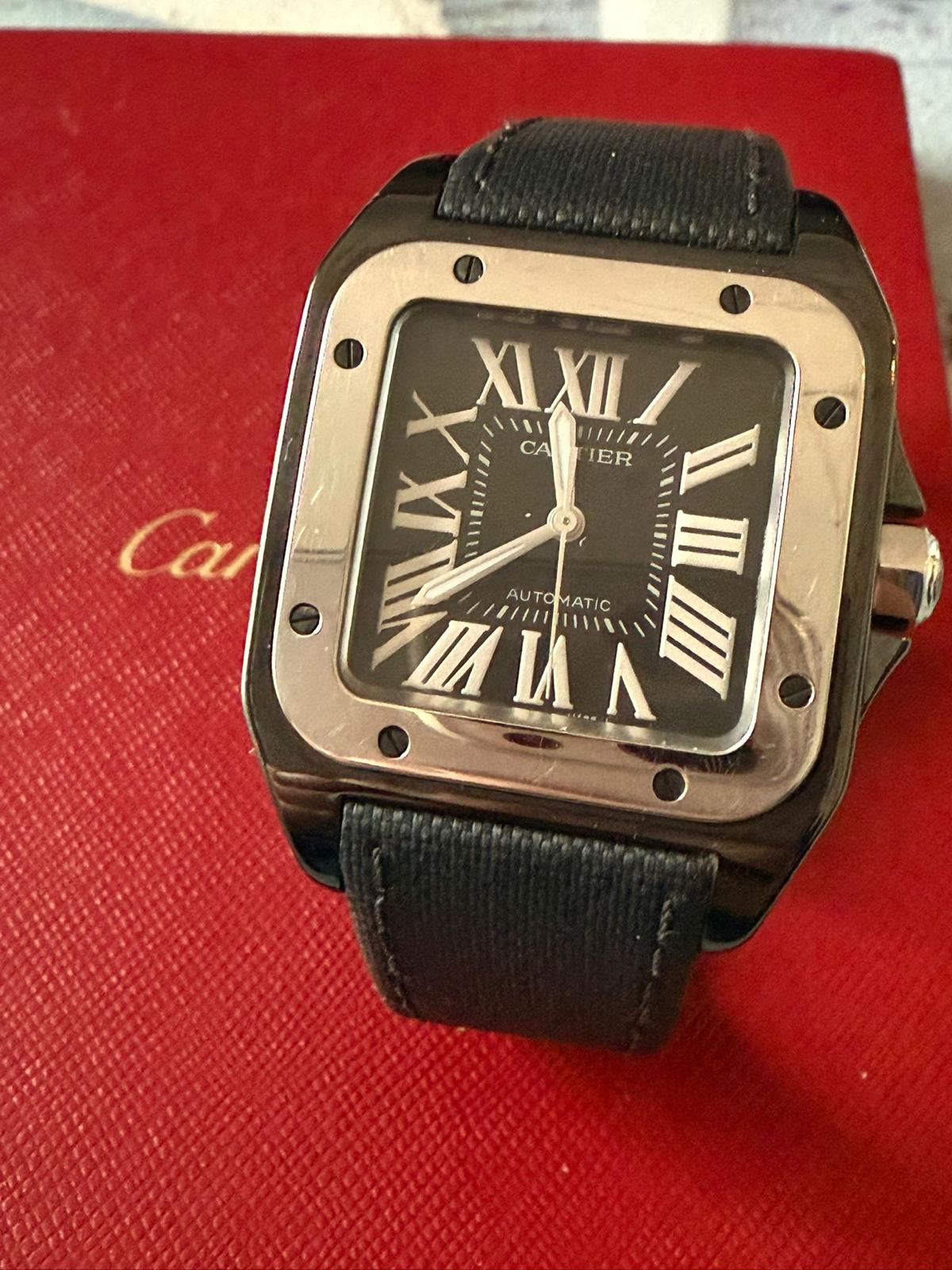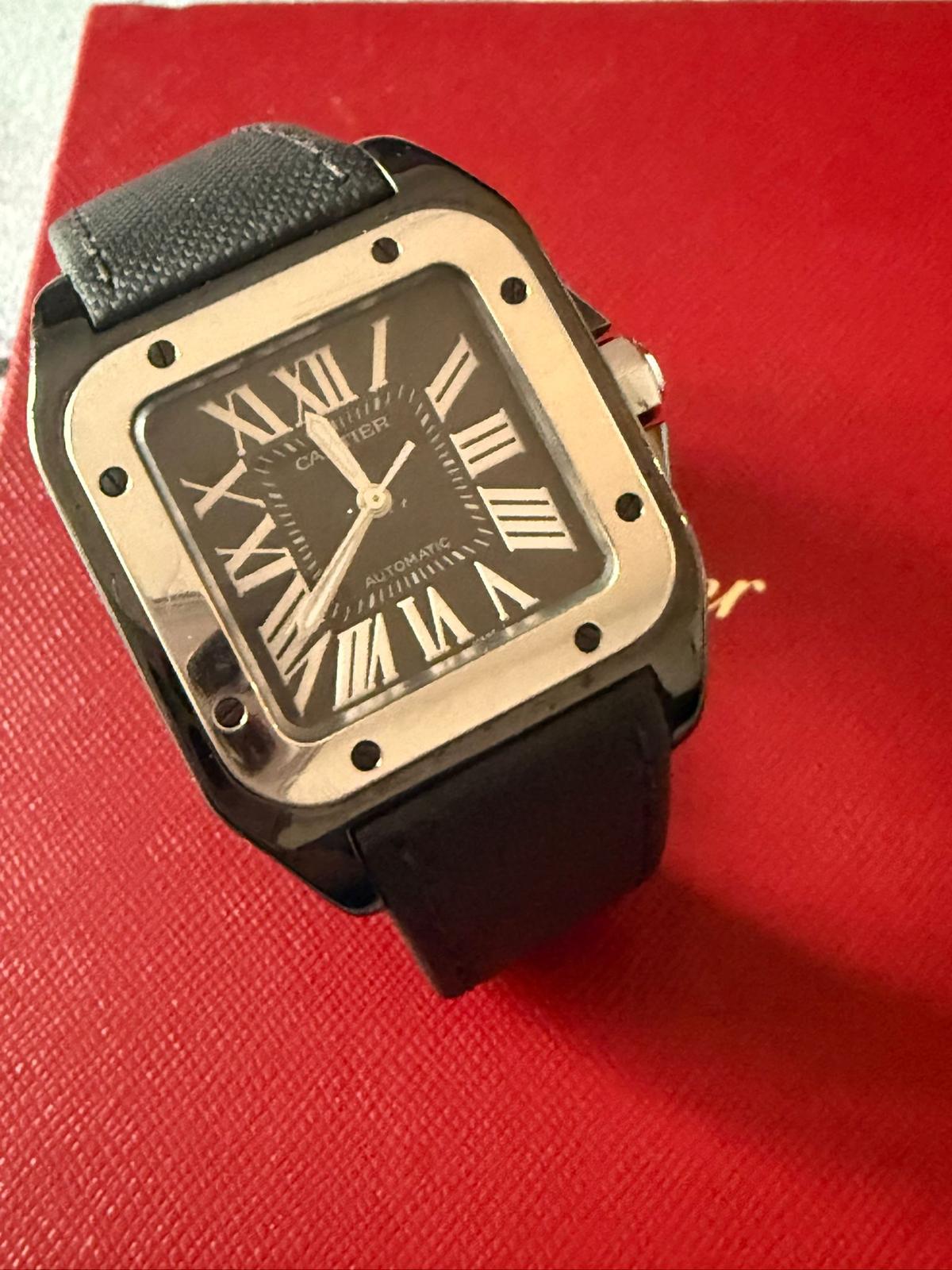 Marca Cartier Modello (Orologio) Santos 100 Numero di referenza 2878 Carica Automatico Materiale della cassa Acciaio Materiale cinturino Pelle Anno di produzione 2015 (Anno approssimativo) Condizione Usato (Ottimo) L'articolo presenta segni di usura lievi, come ad esempio graffi leggeri, ma non percepibili al tatto. Corredo Con documenti originali, senza scatola originale Calibro Carica automatico Materiale della cassa Acciaio Diametro 33 x 44 mm Impermeabile 10 ATM Materiale lunetta Acciaio Vetro Vetro zaffiro Quadrante Nero Numeri sul quadrante Romani Colore cinturino Nero Chiusura Doppia chiusura déployante Materiale chiusura Acciaio