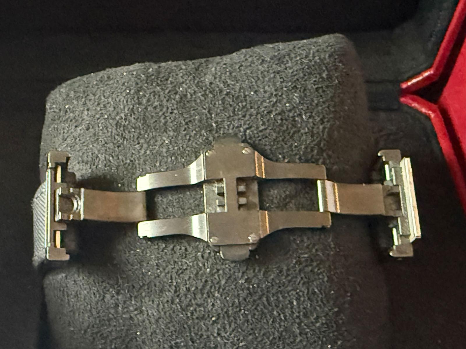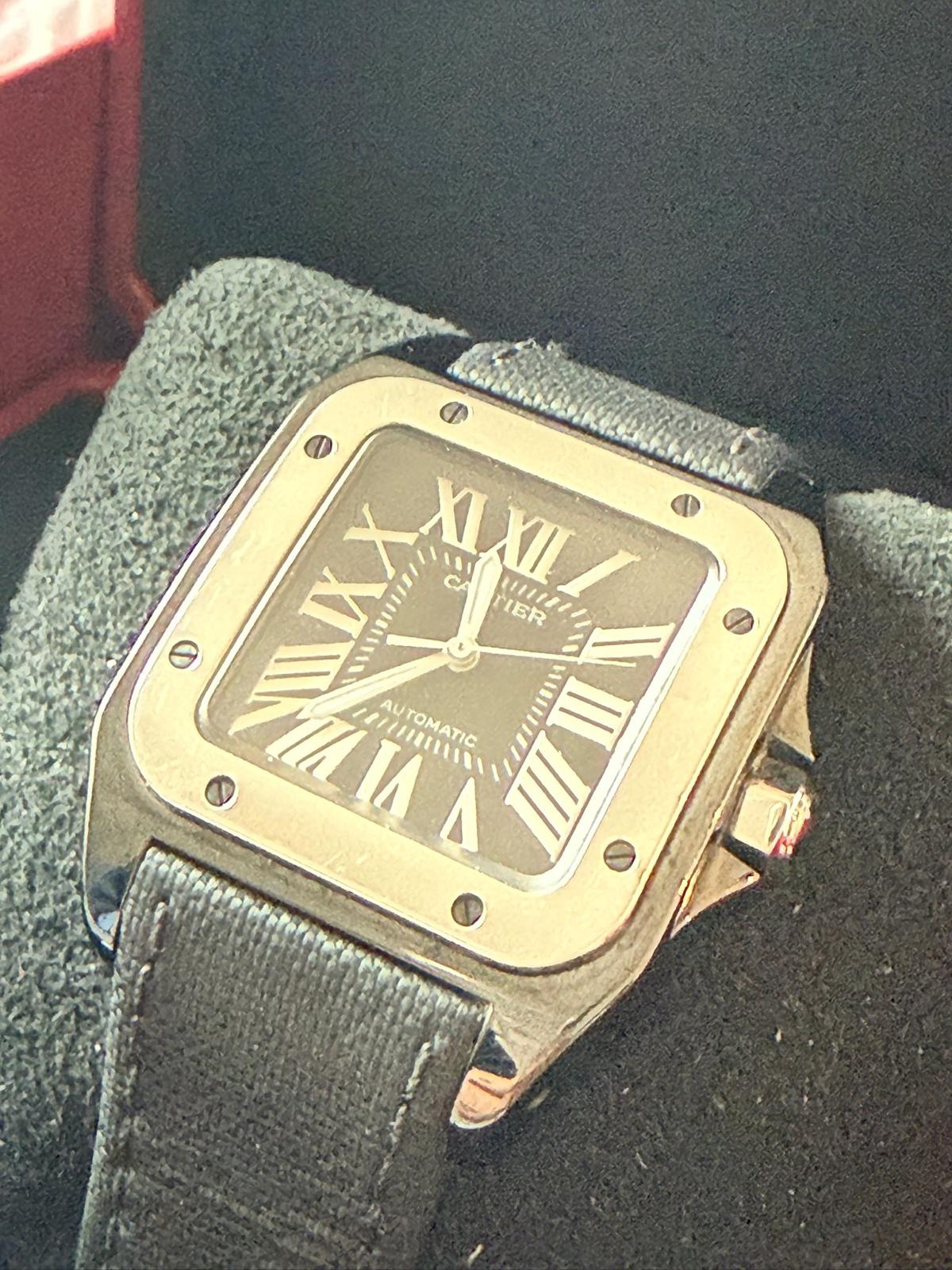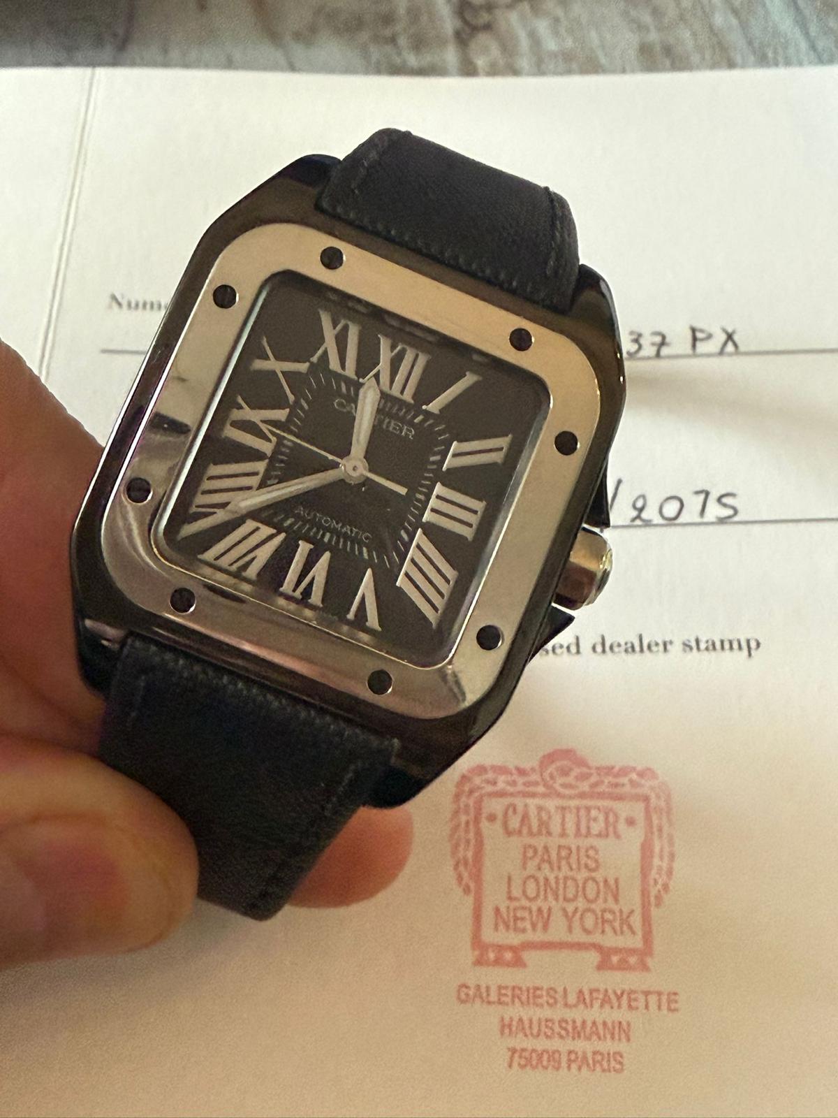 Marca Cartier Modello (Orologio) Santos 100 Numero di referenza 2878 Carica Automatico Materiale della cassa Acciaio Materiale cinturino Pelle Anno di produzione 2015 (Anno approssimativo) Condizione Usato (Ottimo) L'articolo presenta segni di usura lievi, come ad esempio graffi leggeri, ma non percepibili al tatto. Corredo Con documenti originali, senza scatola originale Calibro Carica automatico Materiale della cassa Acciaio Diametro 33 x 44 mm Impermeabile 10 ATM Materiale lunetta Acciaio Vetro Vetro zaffiro Quadrante Nero Numeri sul quadrante Romani Colore cinturino Nero Chiusura Doppia chiusura déployante Materiale chiusura Acciaio