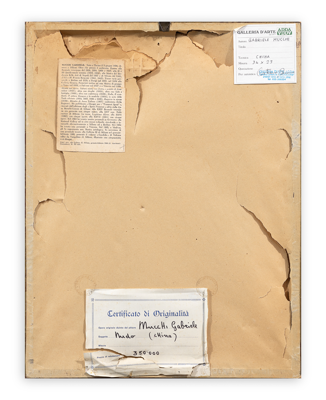 Etichetta della Galleria d'Arte Adda (BG) al retro del cartoncino protettivo