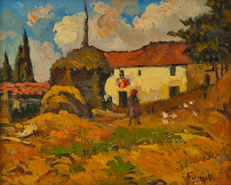 Cafiero Filippelli (Livorno 1889 - 1973) PAESAGGIO CON FIGURA Olio su tavola, cm. 30x37 Firmato in basso a destra. Sul verso: timbri dell'Artista; Timbro "Galleria d'Arte Michelangelo", Firenze.