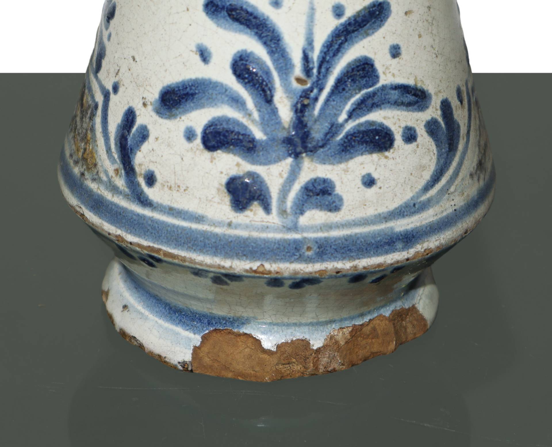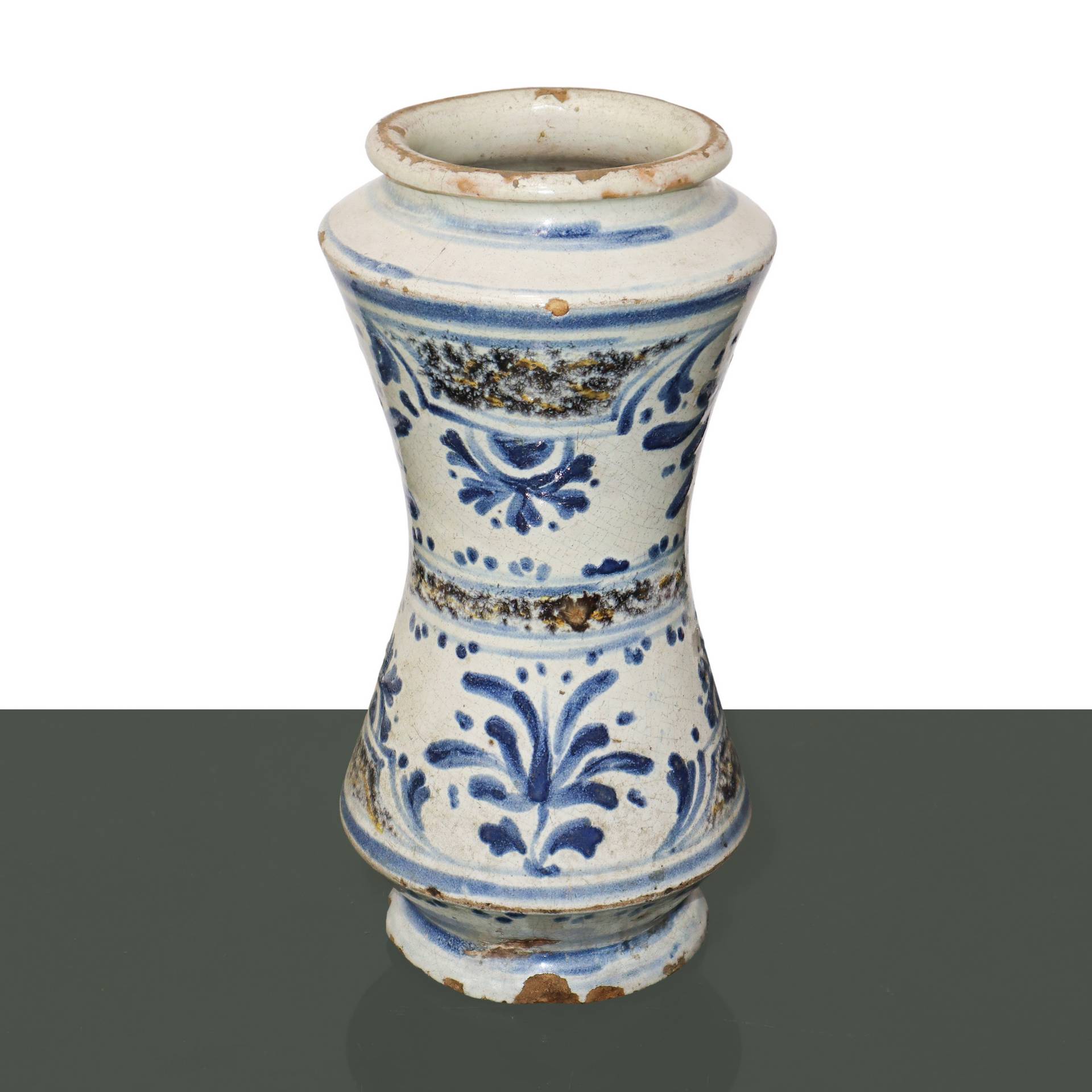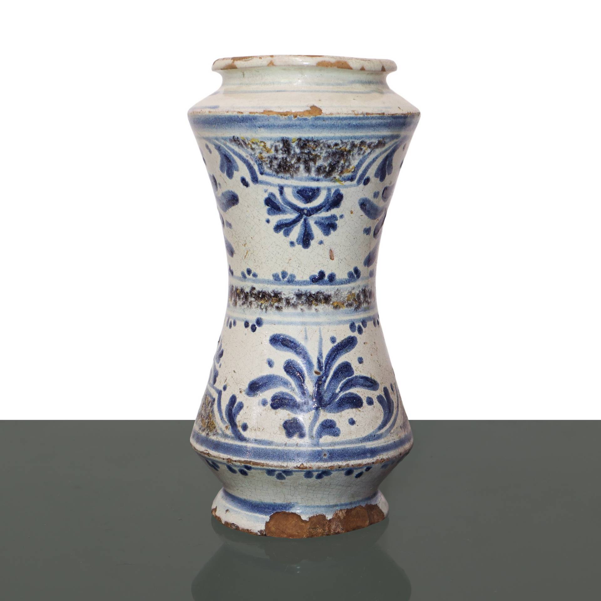 Albarello in maiolica di Caltagirone decorata a mano nei toni blu e manganese a motivi floreali, 18° secolo