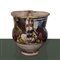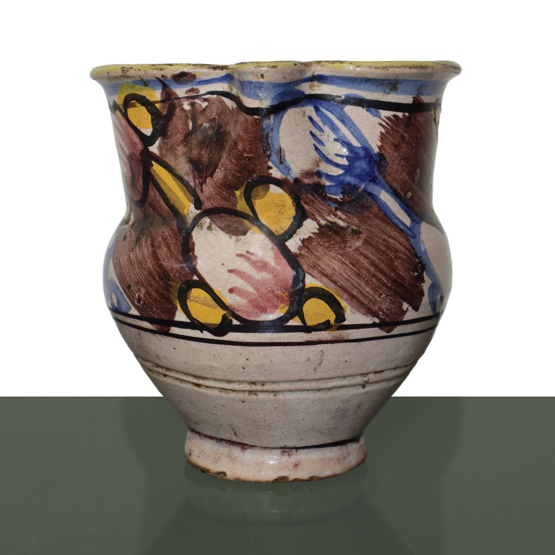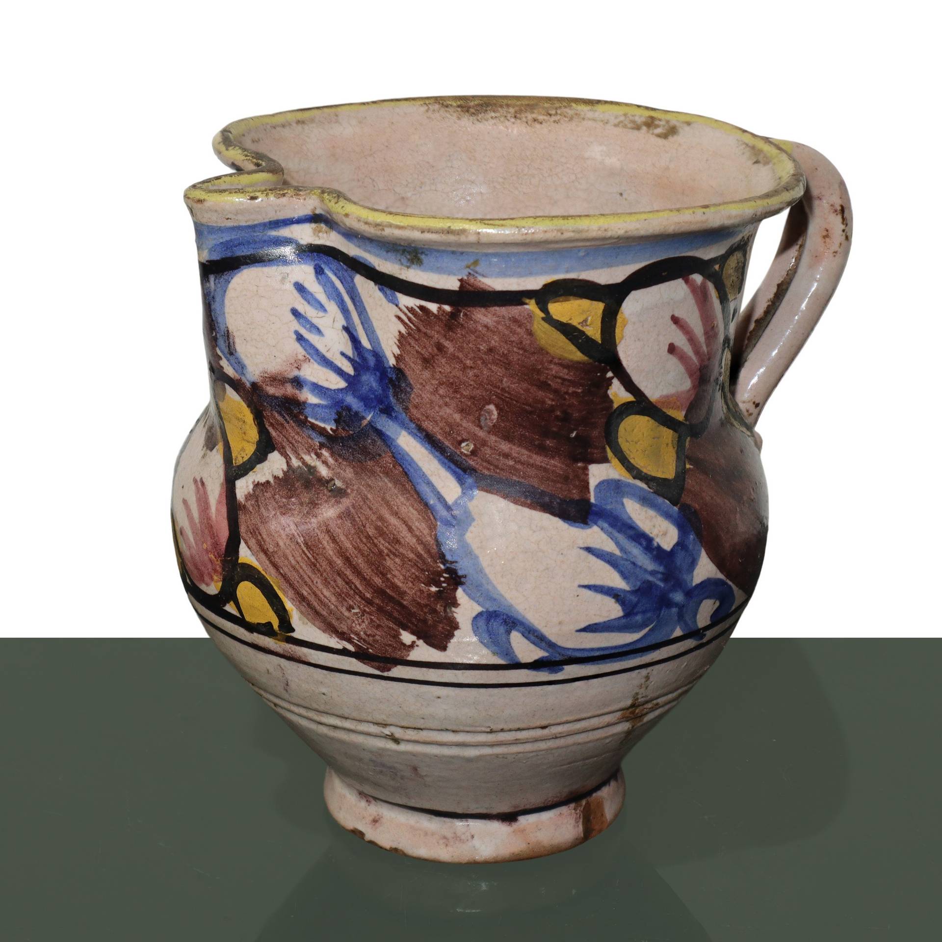 Cannata versatoio in maiolica di Caltagirone invetriata e smaltata policroma, 20° secolo h cm 19
