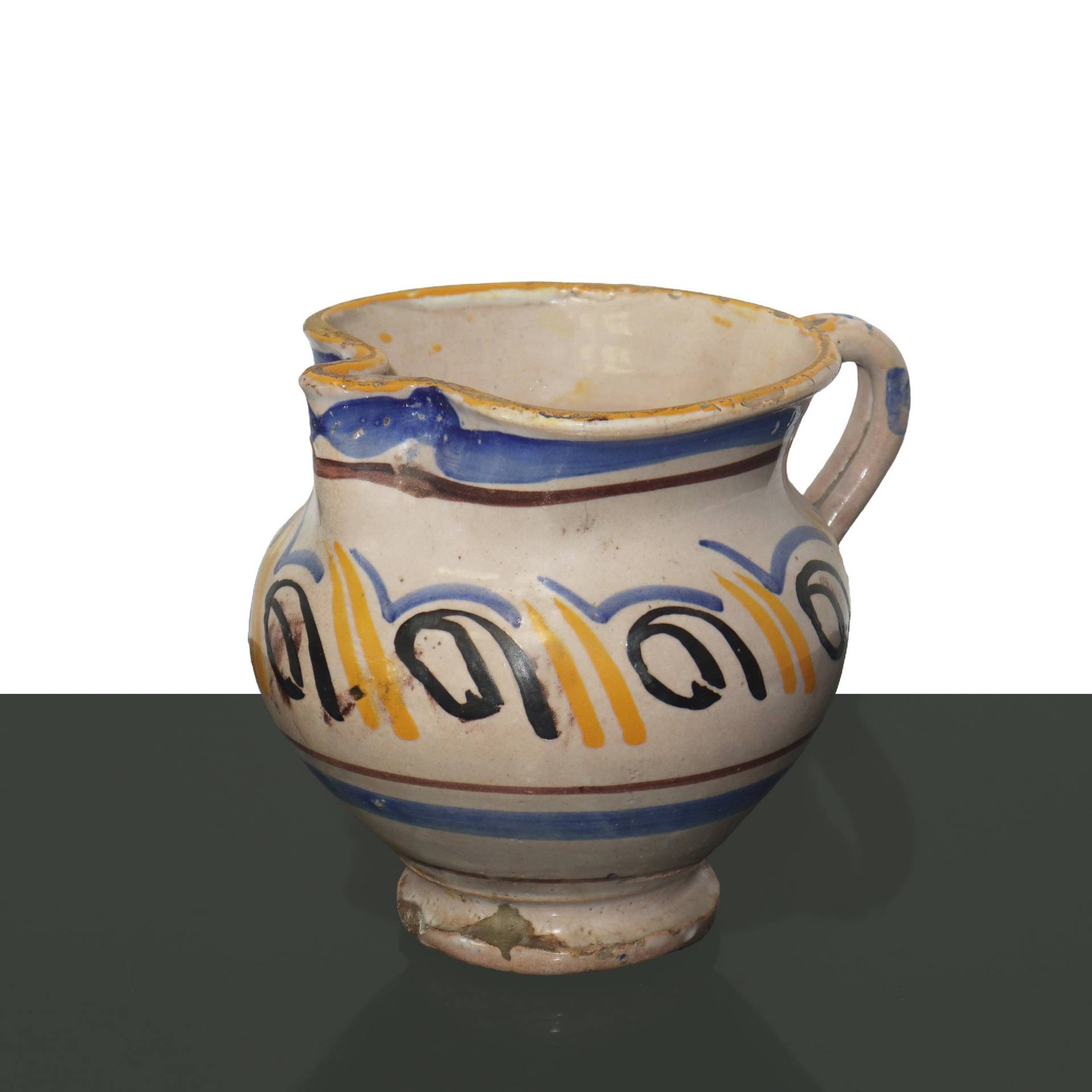 Cannata in maiolica policroma, 20° secolo h cm 15,5x14 Nei toni del giallo, azzurro e manganese.