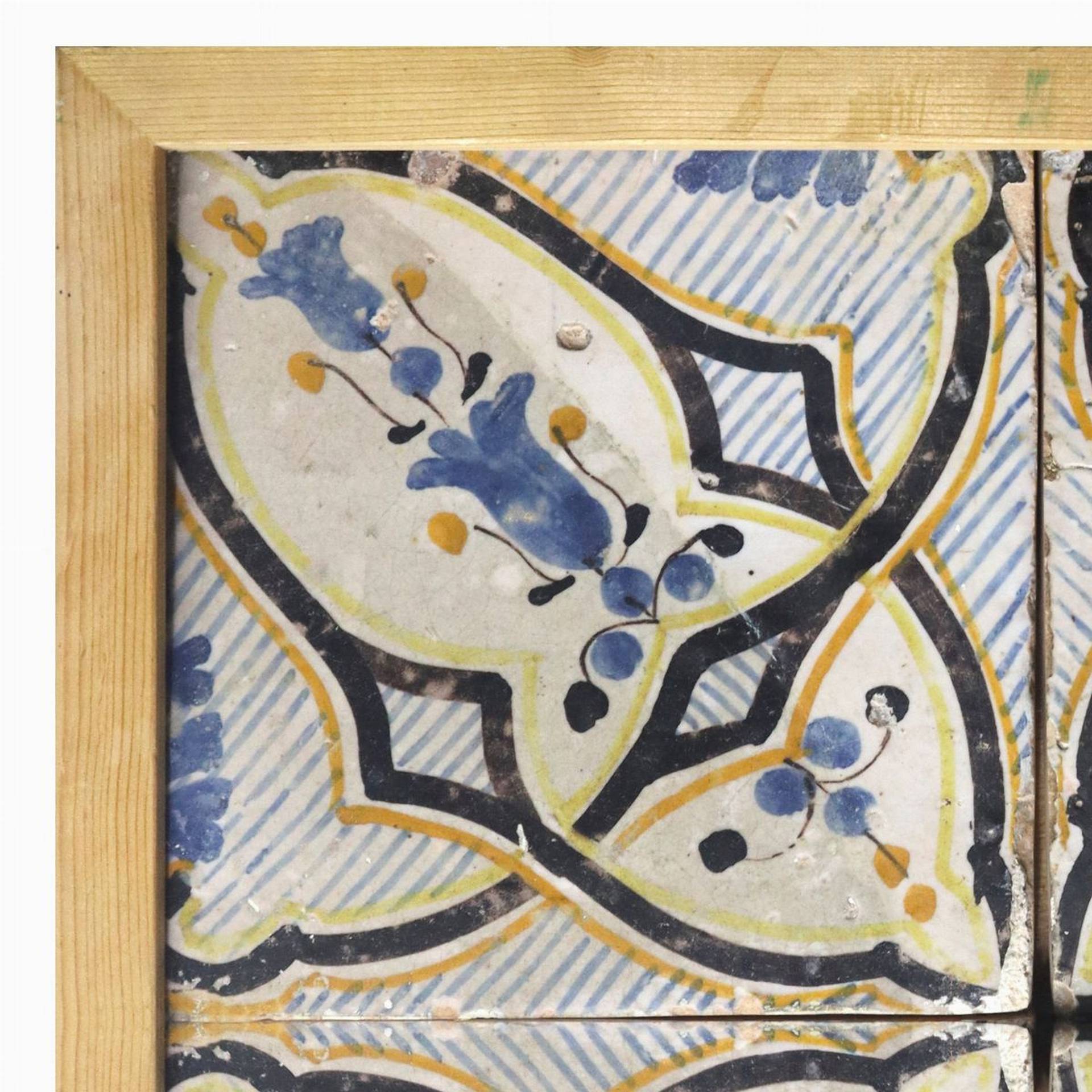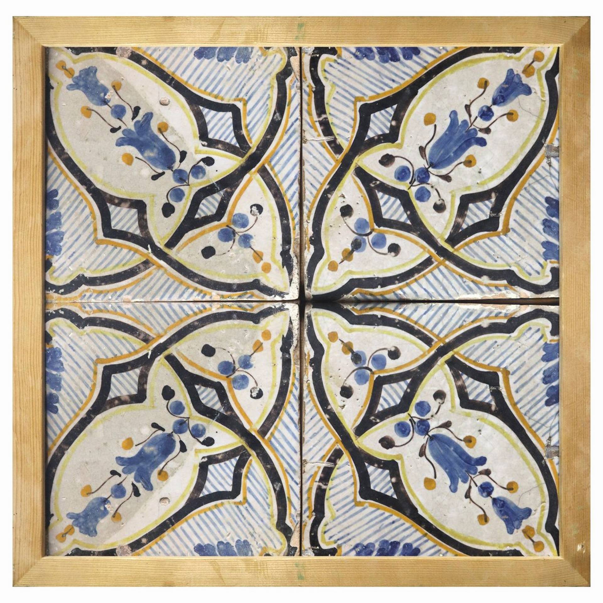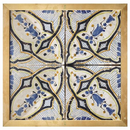 Composizione di N.4 maioliche in ceramica, 19° secolo cm 20 x cm 20 cad. Nei toni dell'azzurro con disegni floreali, in corniceNei toni dell'azzurro con disegni floreali, in cornice