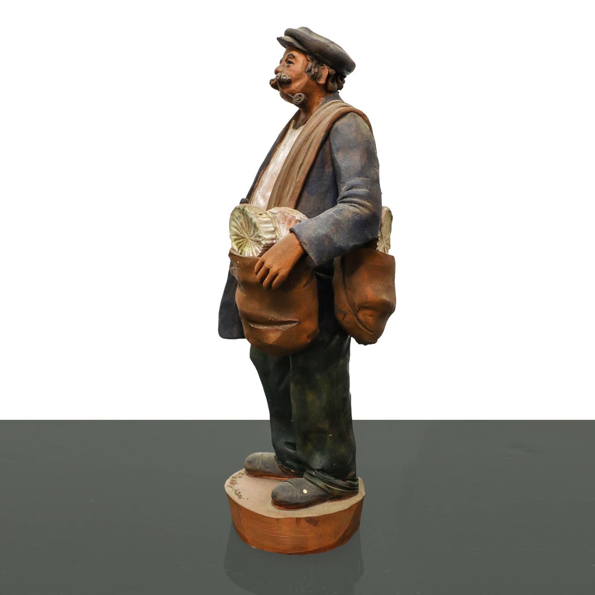 Tre statuine in terracotta di Caltagirone Uomo con formaggi, venditore di ceste, pescatore