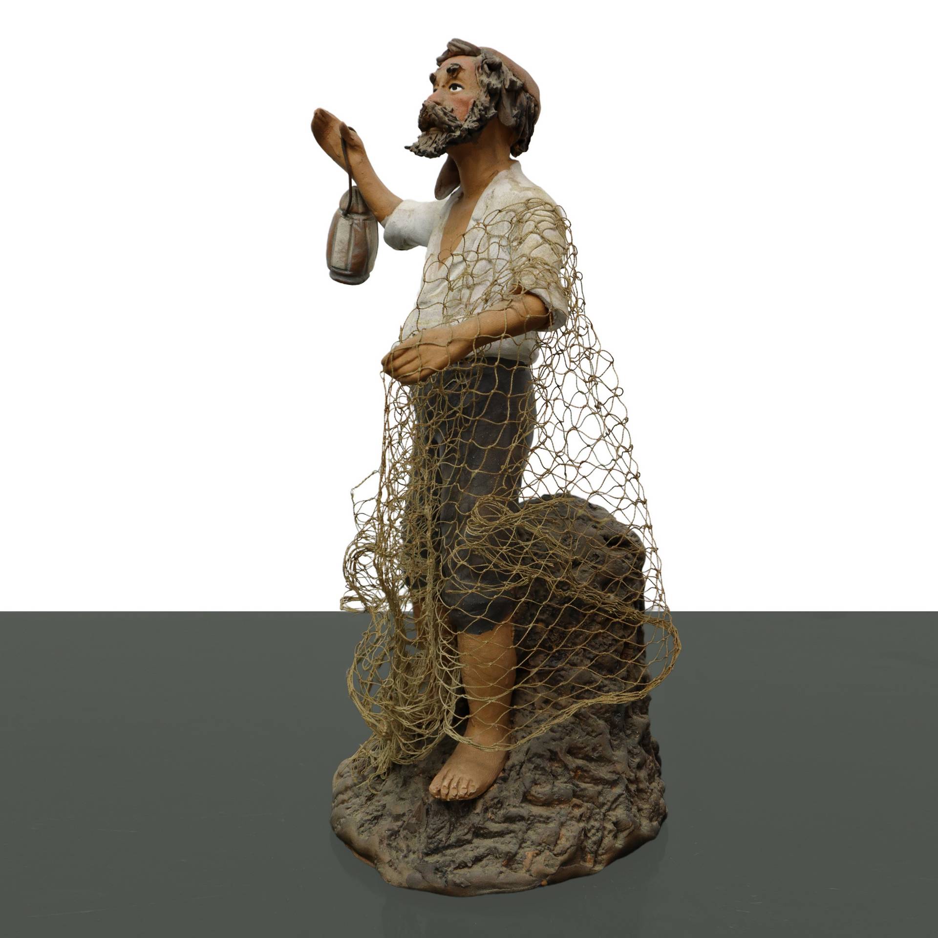 Tre statuine in terracotta di Caltagirone Uomo con formaggi, venditore di ceste, pescatore H cm 24 - ven. ceste cm 24 - pescatore cm 25