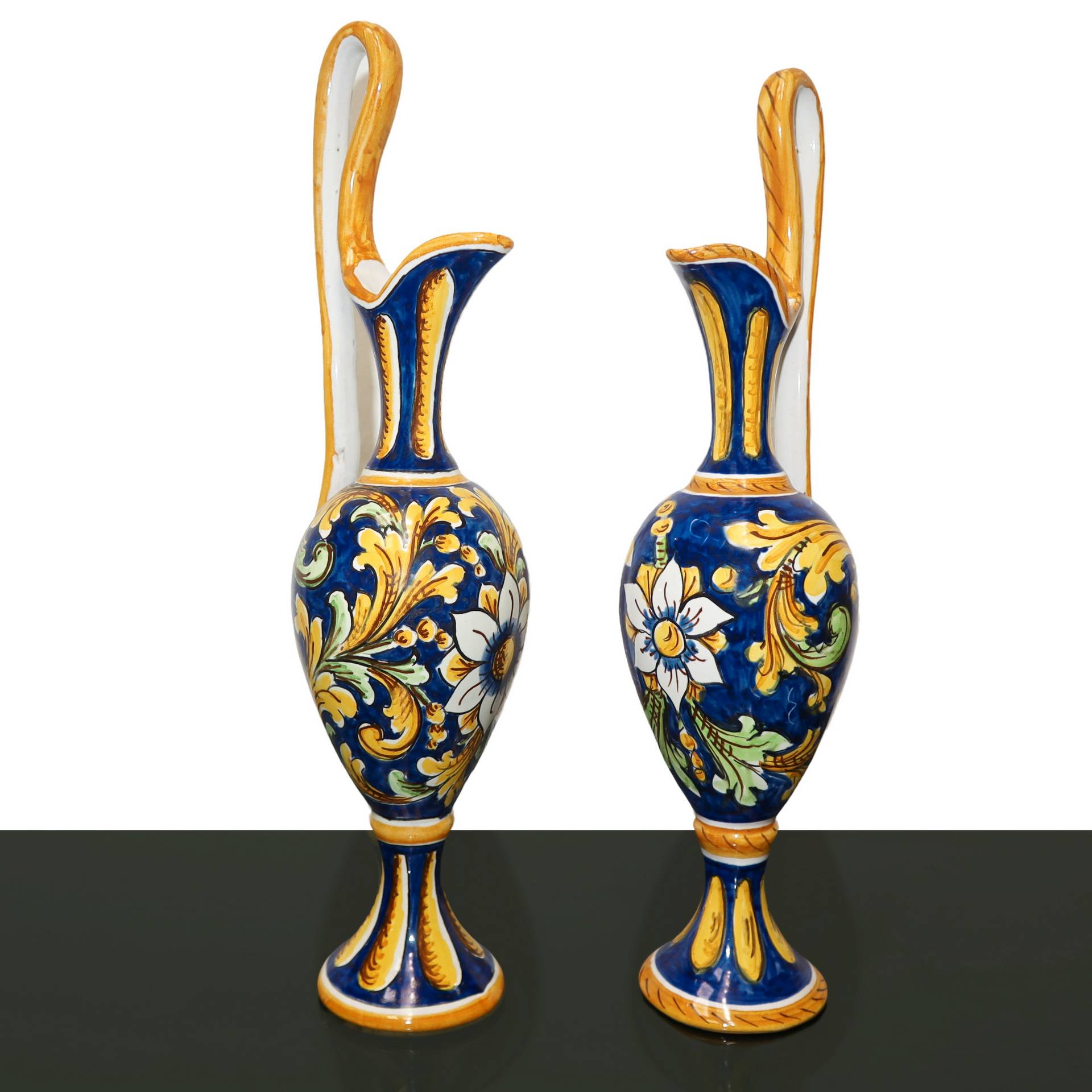 Salvatore Iudici (Caltagirone) - Coppia di anfore con manico in maiolica di Caltagirone, 20° secolo h cm 36 Fondo blu e disegno a larghe foglie con margherita nei toni del giallo e verde. Fondo blu e disegno a larghe foglie con margherita nei toni del giallo e verde.