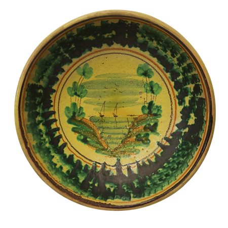 Piatto di Caltagirone in maiolica decorata e smaltata con raffigurazione di barche, 20° secolo diametro 41,5