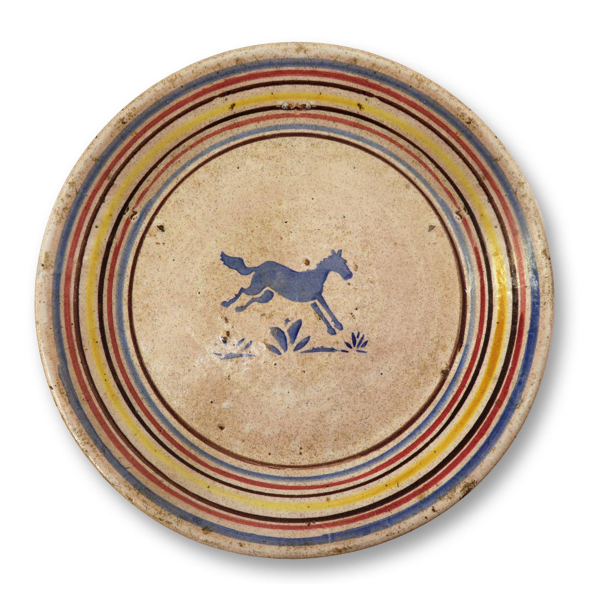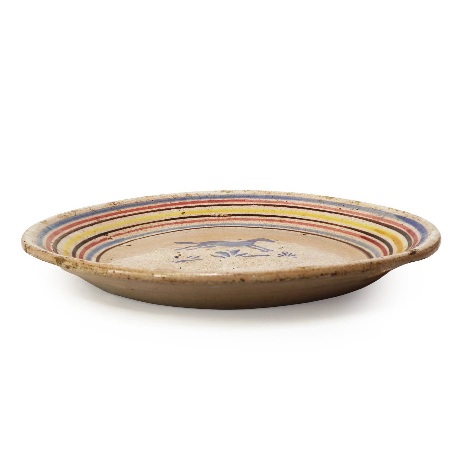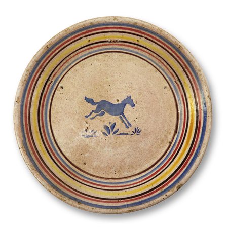 Piatto in maiolica di Caltagirone decorato policromo con al centro cavallo in corsa, Primi 20° secolo