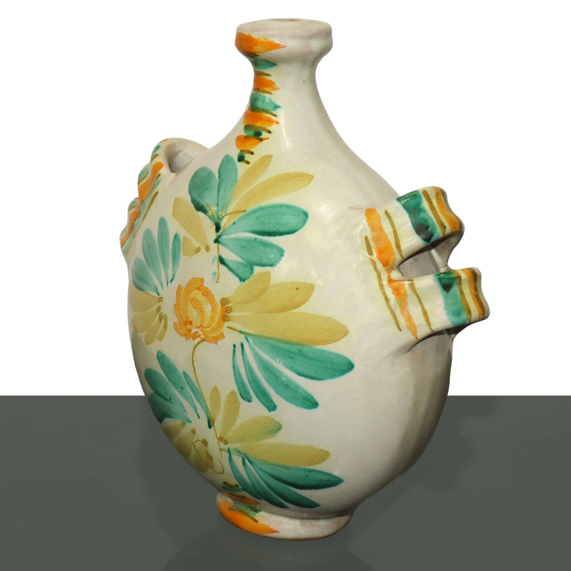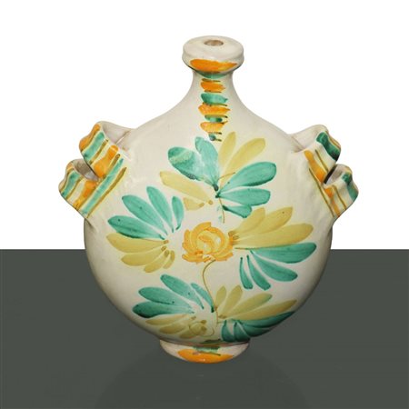 Borraccia in maiolica di Caltagirone invetriata e smaltata policroma decorata a tralci, 20° secolo