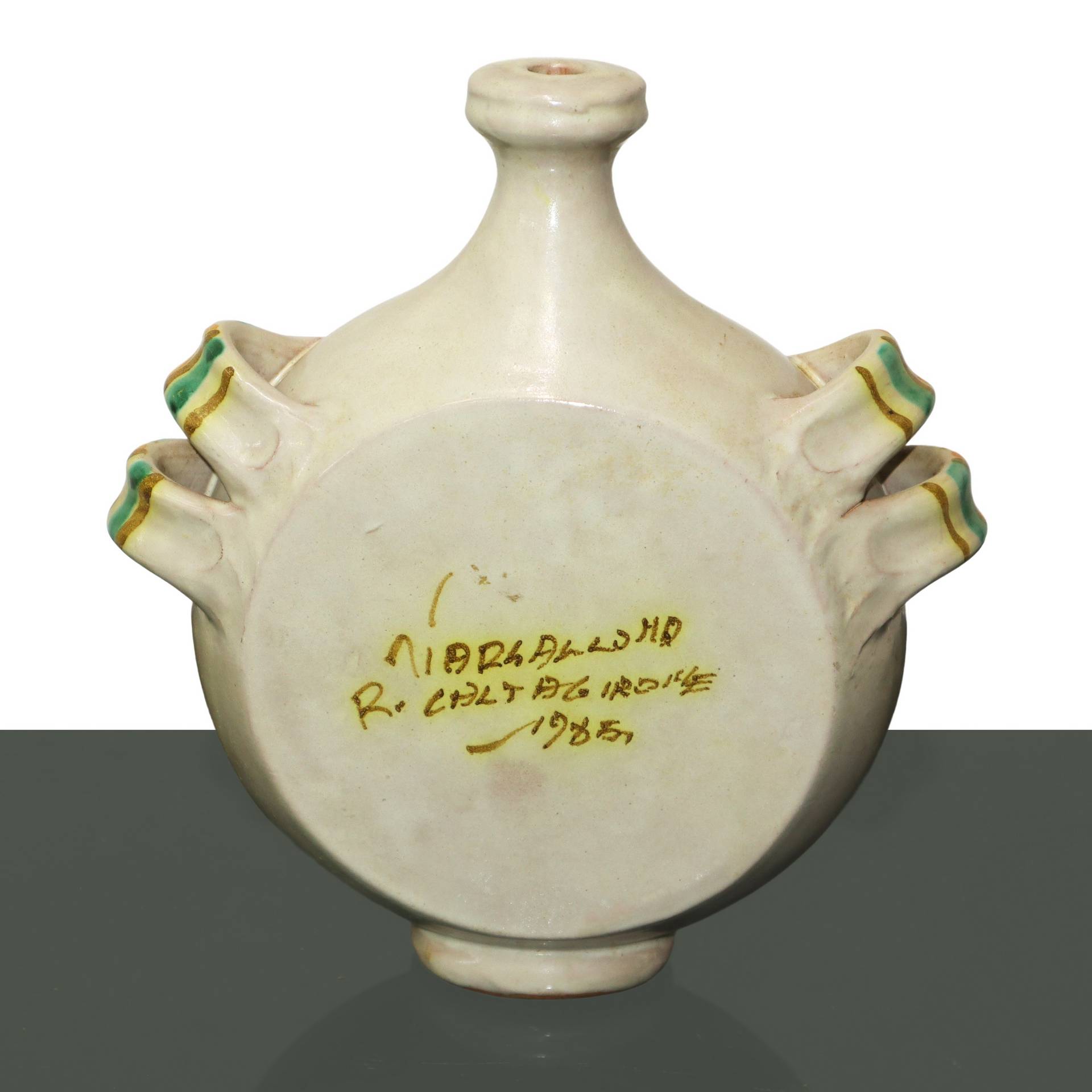Borraccia in maiolica di Caltagirone invetriata e smaltata policroma decorata a tralci, 20° secolo h cm 24 Firmata sul retro Marsallona Firmata sul retro Marsallona