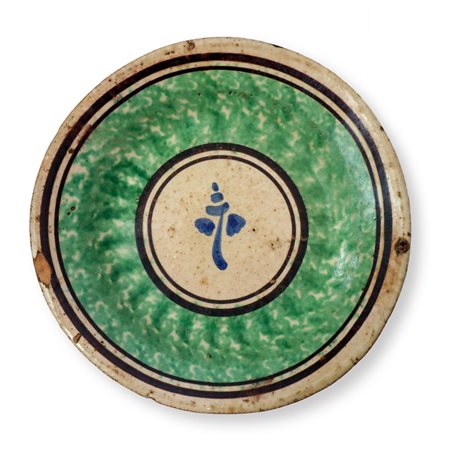 Piatto di Caltagirone spugnato verde e decorato al centro con fiore, Primi 20° secolo cm 24