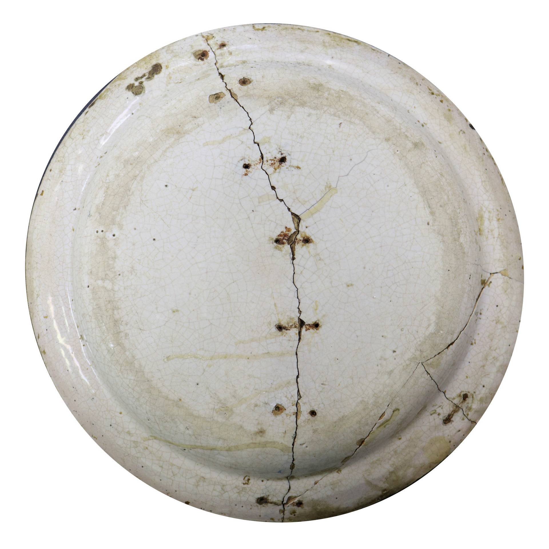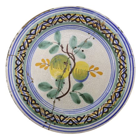 Piatto in maiolica di Caltagirone al centro dipinto con coppia di frutti gialli, 20° secolo diametro cm 43 RestauratoRestaurato