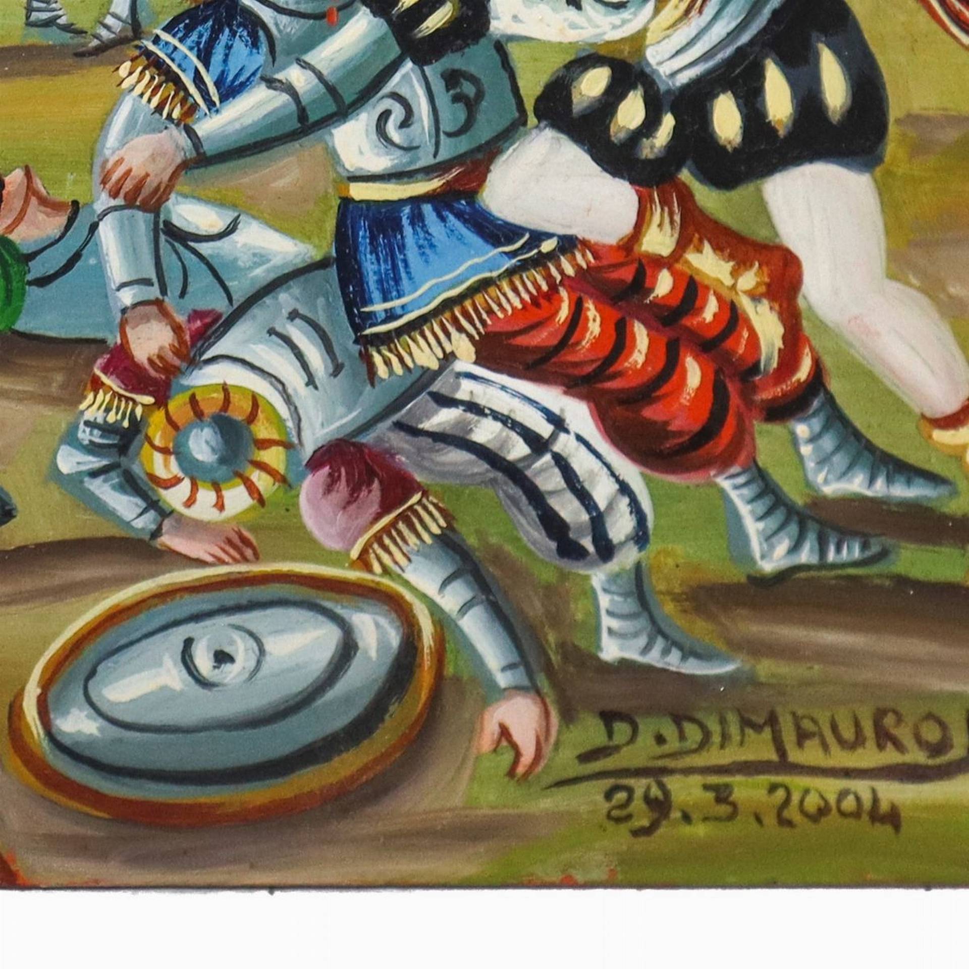 Scena di combattimento tra Paladini e Saraceni, firmata Domenico Di Mauro, Tavoletta dipinta a olio cm 30x38,5 Datata 29.03.2004Datata 29.03.2004