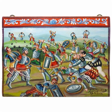 Scena di combattimento tra Paladini e Saraceni, firmata Domenico Di Mauro, Tavoletta dipinta a olio