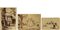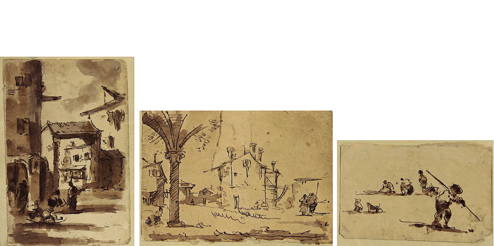 Tre disegni a penna acquarellata su carta, cm 18,8x12,4; 13,2x19,2 e 9,4x14,2; qualche difetto.