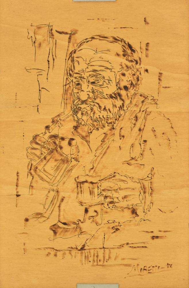 Moretti VECCHIO ALL'OSTERIA pirografia su tavola di legno, cm 40x20 firma e...