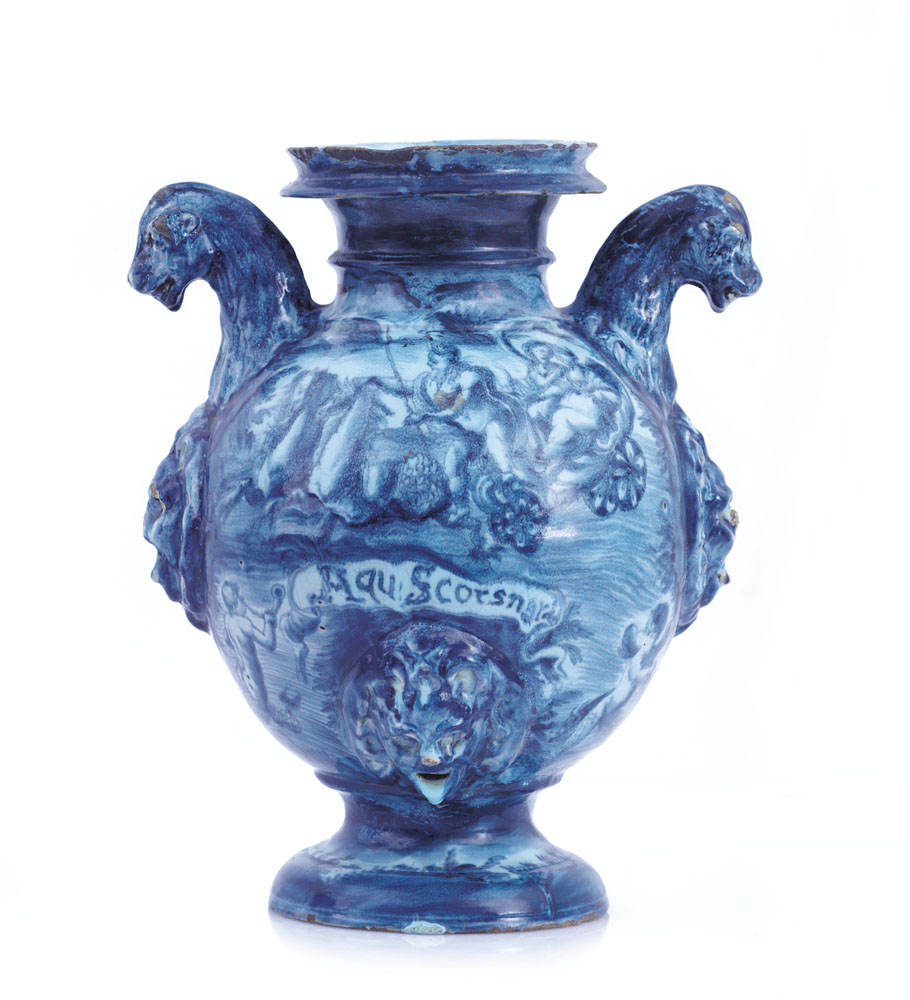 STAGNONE IN MAIOLICA, SAVONA, XVII SECOLO, ovoidale con anse a protomi leonine e mascherone, versatoio a testa di leone, decoro in blu su fondo berettino: sul fronte a Nettuno con cocchio e divinità trainato da cavalli marini, cartiglio con "Aqu. Scorsnara", nel verso Mosè salvato dalle acque. marca "G.V" coronata; sbeccature al collo e alla base, lievi cadute di smalto.