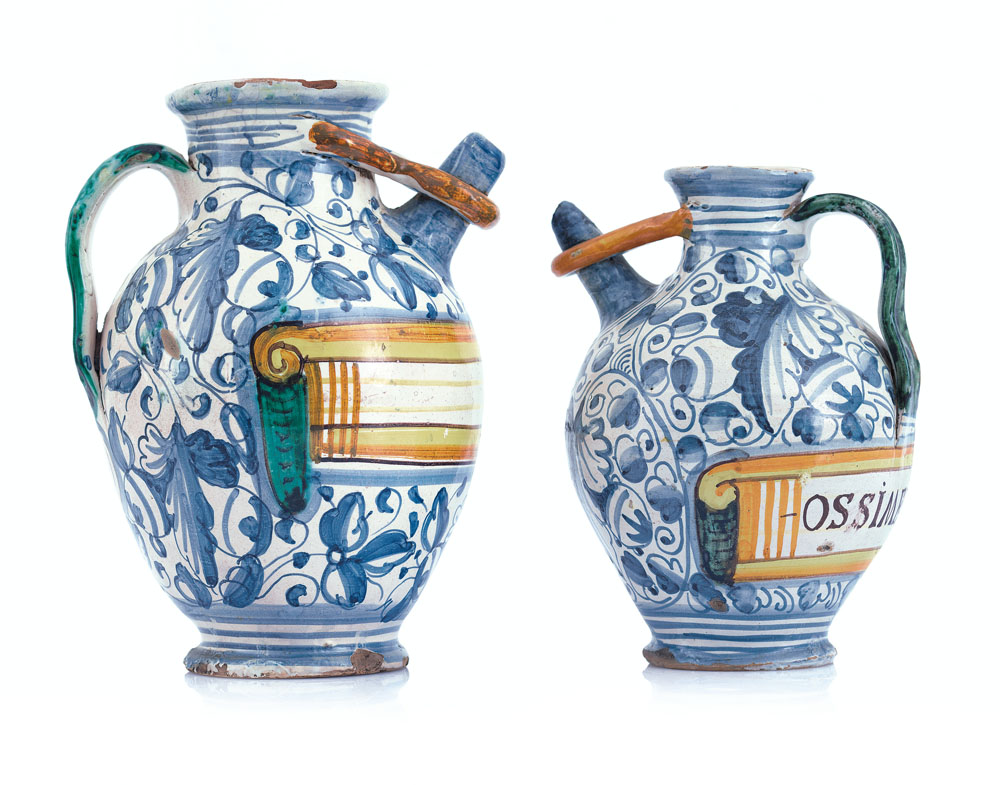 DUE ORCIOLI IN MAIOLICA, MONTELUPO, XVII SECOLO, decoro turchino a girali con foglie e cartiglio giallo di cui uno con scritta "OSSIMEC CONP.TO"; sbeccature e fessure.