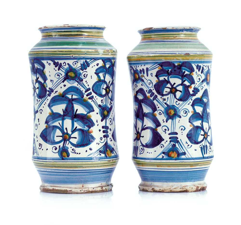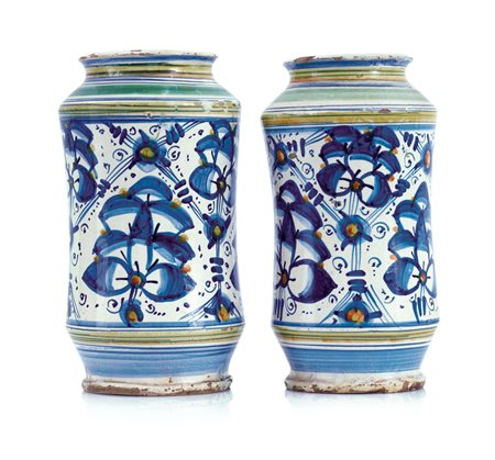 COPPIA DI ALBARELLI IN MAIOLICA, MONTELUPO, ULTIMO QUARTO DEL XVI SECOLO, decoro policromo a palmette stilizzate; sbeccature.