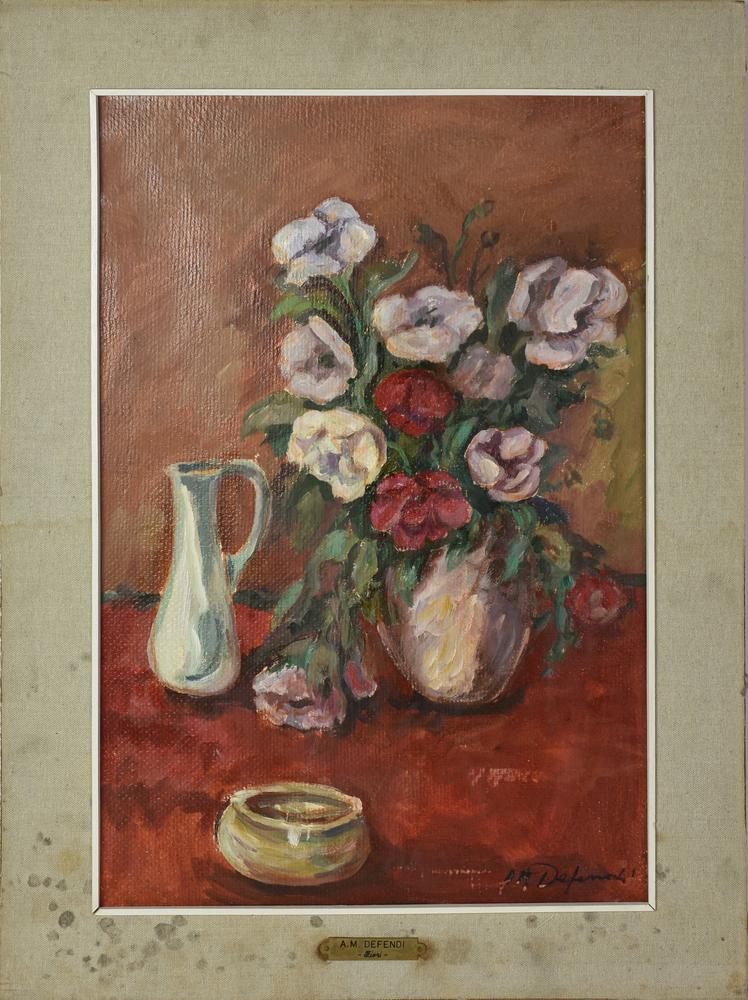 A.M. Defendi VASO DI FIORI olio su tela di juta, cm 58x37 firma