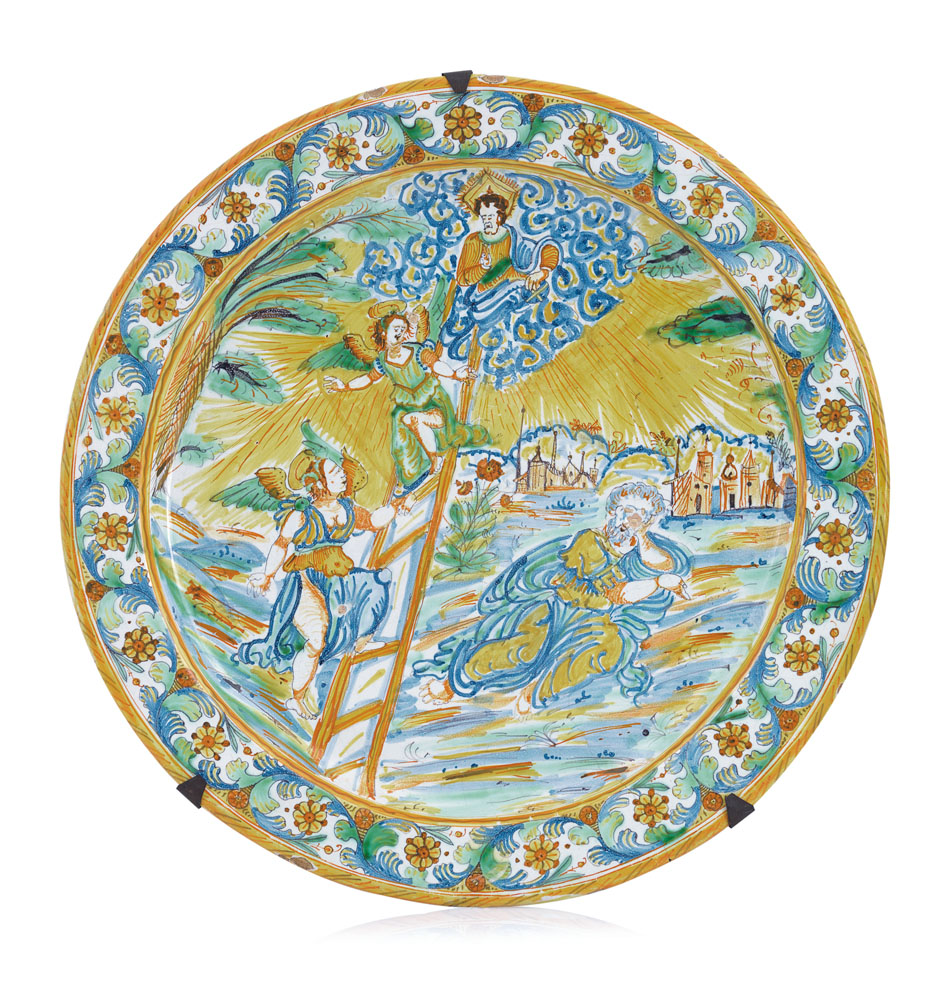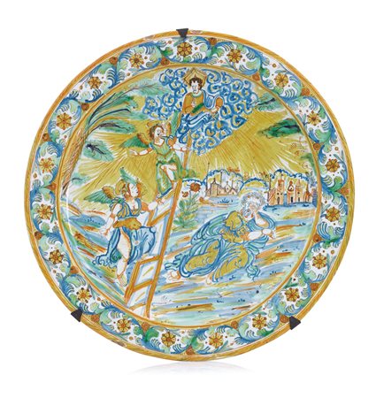GRANDE PIATTO ISTORIATO IN MAIOLICA, DERUTA, XVII SECOLO, bordo rialzato, decoro policromo con "il sogno di San Giacobbe" entro paesaggio, girali fiorite a contorno; lievi cadute di smalto e fessure.