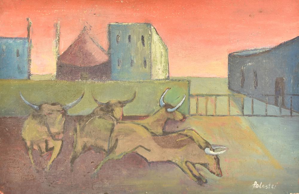 Polastri CARICA DI TORI tempera su cartone telato, cm 27x40 firma Danni