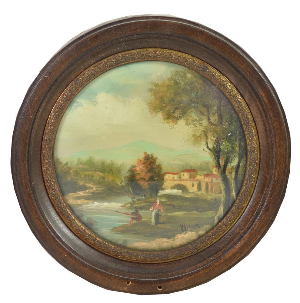 Lotto 194 | Ignoto PAESAGGIO olio su rame, diam cm 9 firma