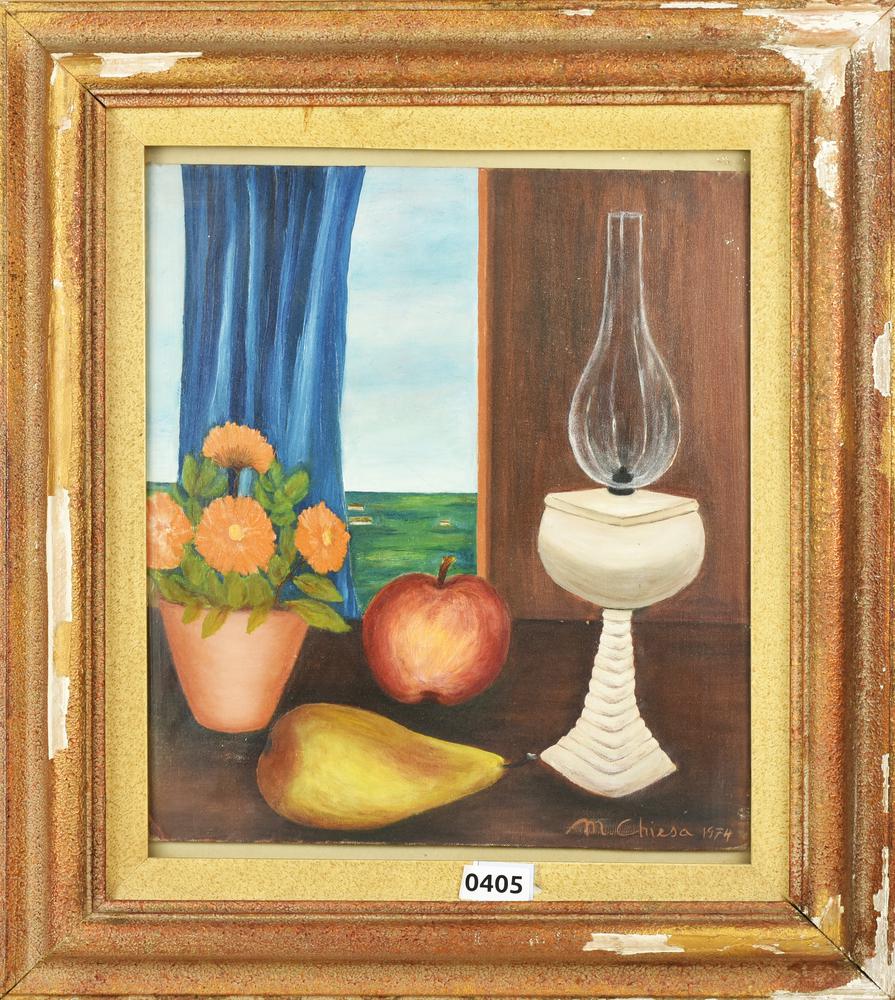 M. Chiesa NATURA MORTA olio su cartone telato, cm 46,5x36,5 firma e data...